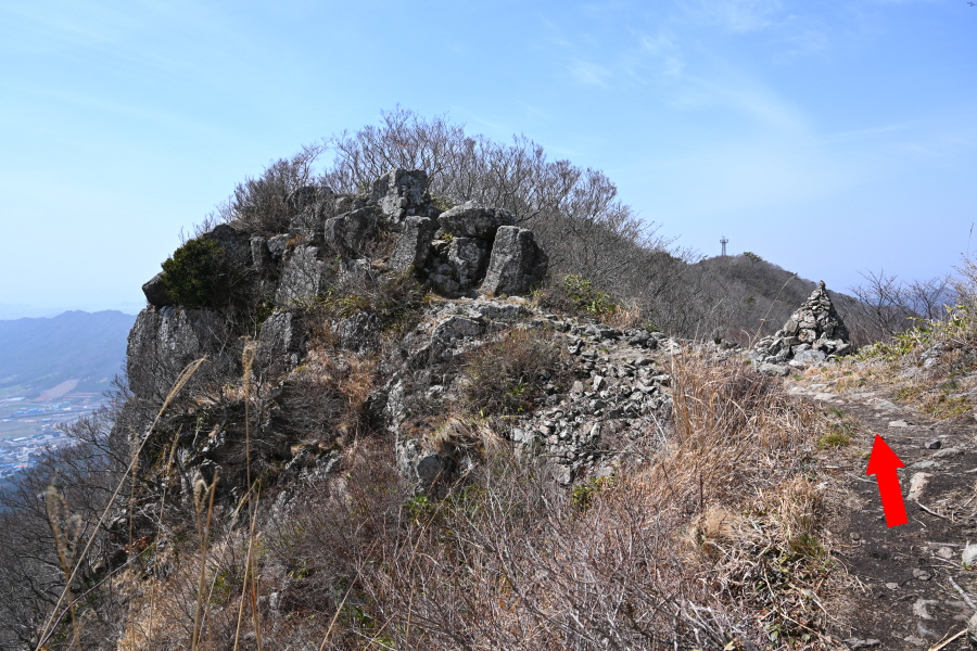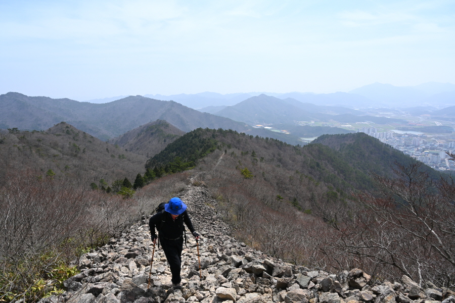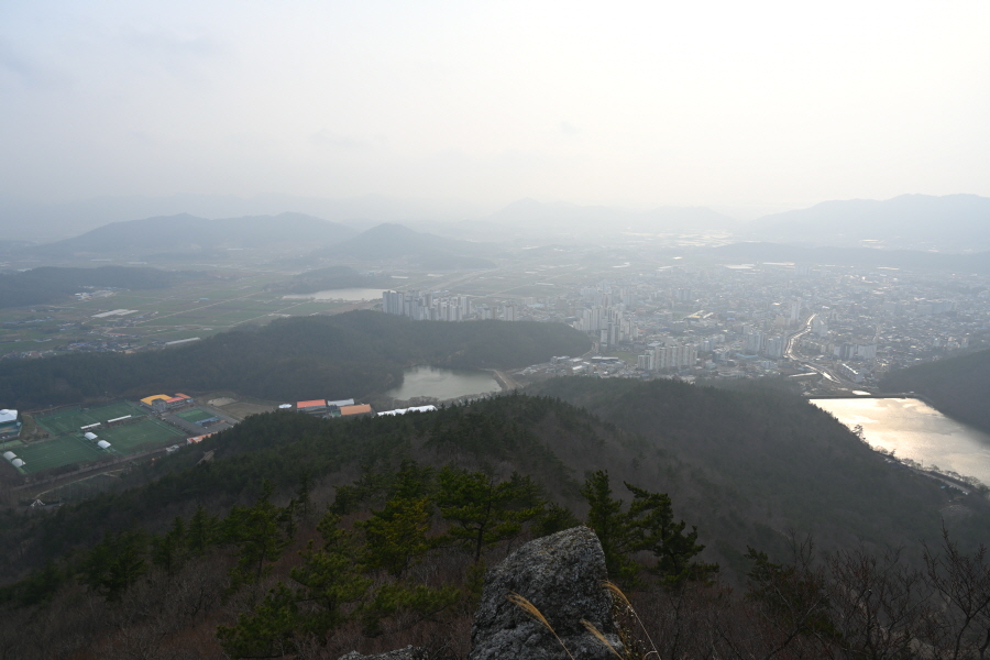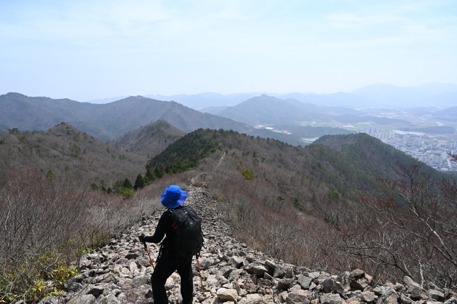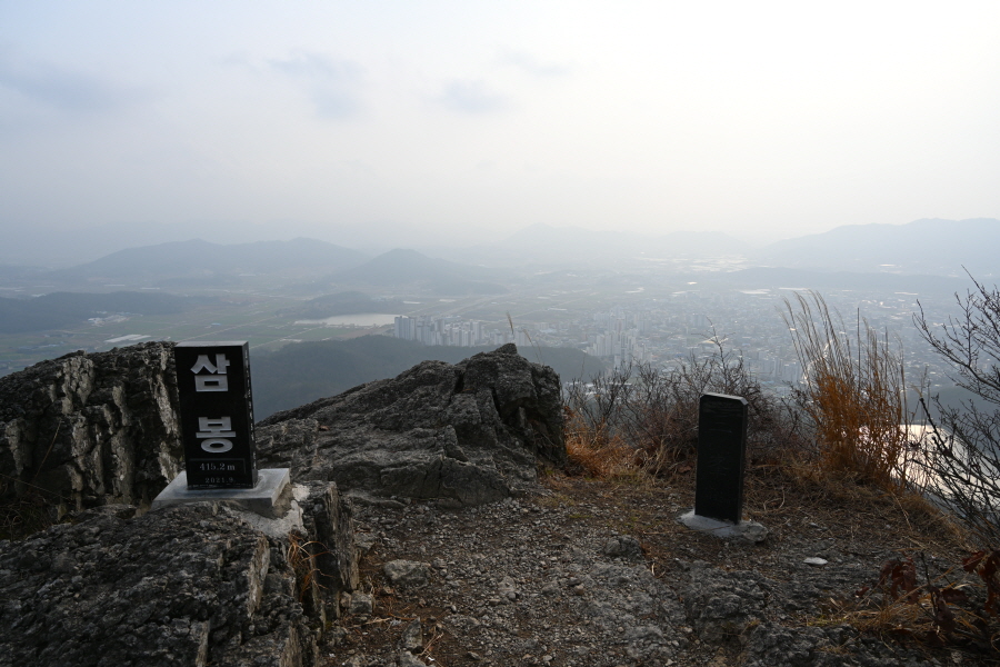 두 곳의 우슬경기장 갈림길을 지나 바위 벼랑에 전망이 열리는 삼봉에 도착합니다.