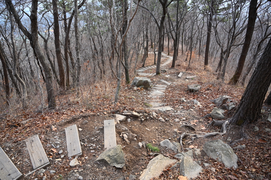 삼봉을 왼쪽으로 돌아 침목계단을 내려갑니다. 임도를 가로 질러 정자 쉼터를 지나, 만대산 정상에서 약 1시간 20분이면 앞서 거쳤던 저수지 제방 옆 도로에 내려서며 산행은 끝납니다.