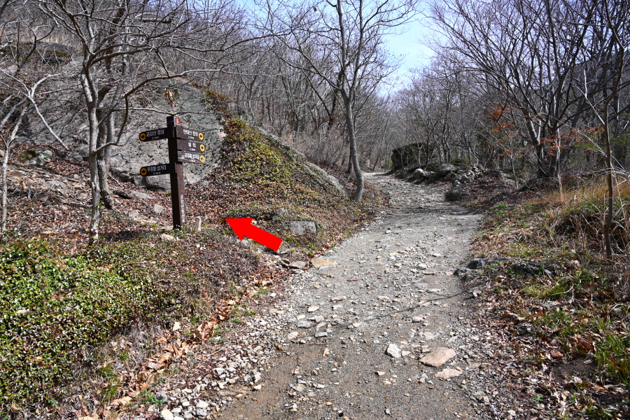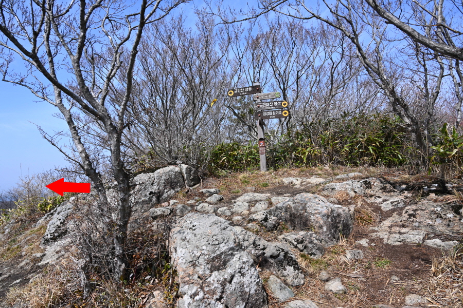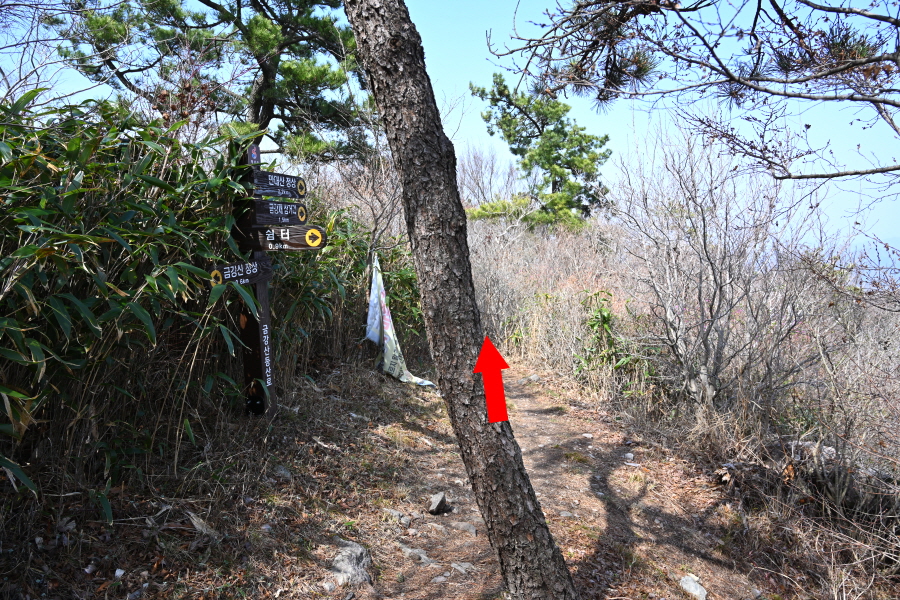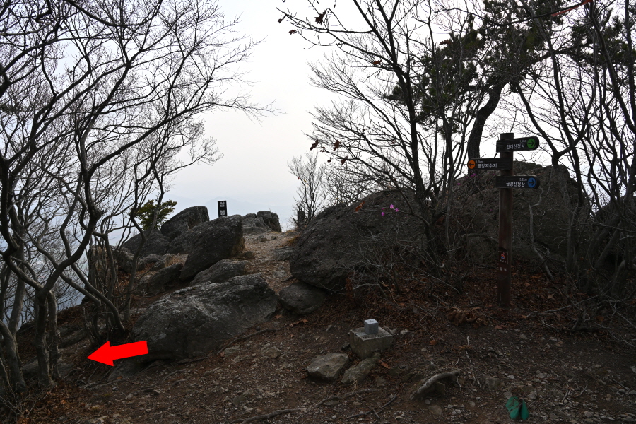 곧 Y자 갈림길에서 왼쪽 금강산 정상으로 능선을 탑니다. 오른쪽은 금강샘 방향.