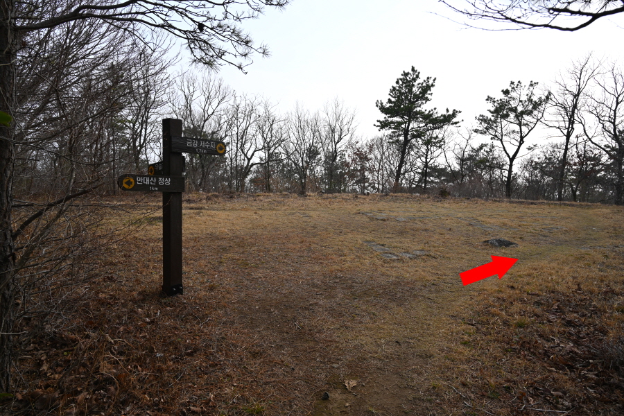 약 8분 능선을 오르면 T자 갈림길에서 만대산 정상은 왼쪽으로 갑니다. 오른쪽은 금강저수지 방향. 정면에 황소 뿔을 닮은 두 개의 봉우리에서 오른쪽이 만대산입니다.