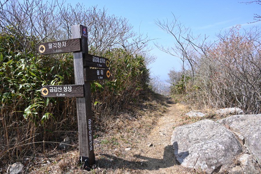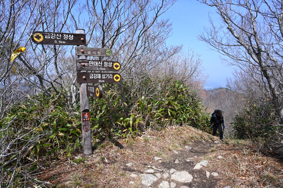 앞서 거쳤던 금강산 삼거리로 되돌아가 금강재 삼거리(2㎞)·만대산 정상(3.7㎞)으로 직진합니다.