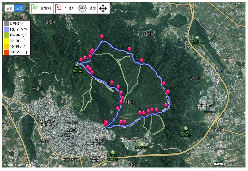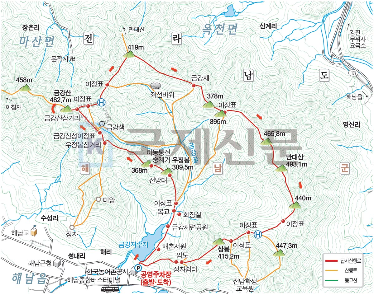 해남군 해남읍 성리 금강저수지 아래 공영주차장을 출발해 해촌서원~공중화장실 갈림길~금강산정상·만대산정상 갈림길~우정봉~우정봉 삼거리~금강산 정상·금강샘 갈리길~금강산성~금강산 삼거리~금강산정상~금강산 삼거리~금강재 삼거리·우정봉삼거리 갈림길~헬기장~만대산정상·쉼터 갈림길~419m봉~금강재~만대산정상·금강저수지 갈림길~만대산정상~헬기장~두 곳의 우슬경기장 갈림길~삼봉정상~임도~정자 쉼터~금강저수지 제방 옆 도로에 내려 선 뒤 공영주차장으로 되돌아오는 원점회귀입니다. 산행거리는 약 10.4㎞이며, 5시간 30분 안팎이 걸립니다.
