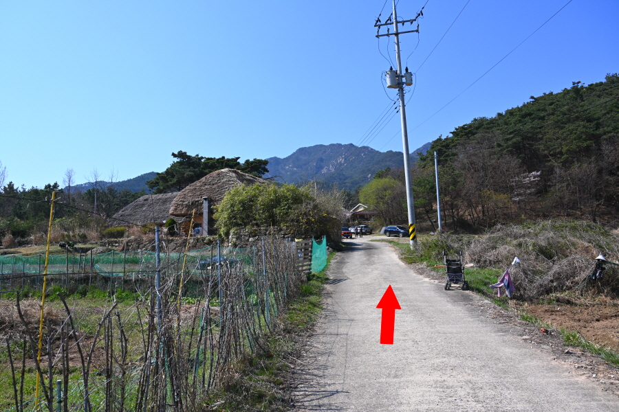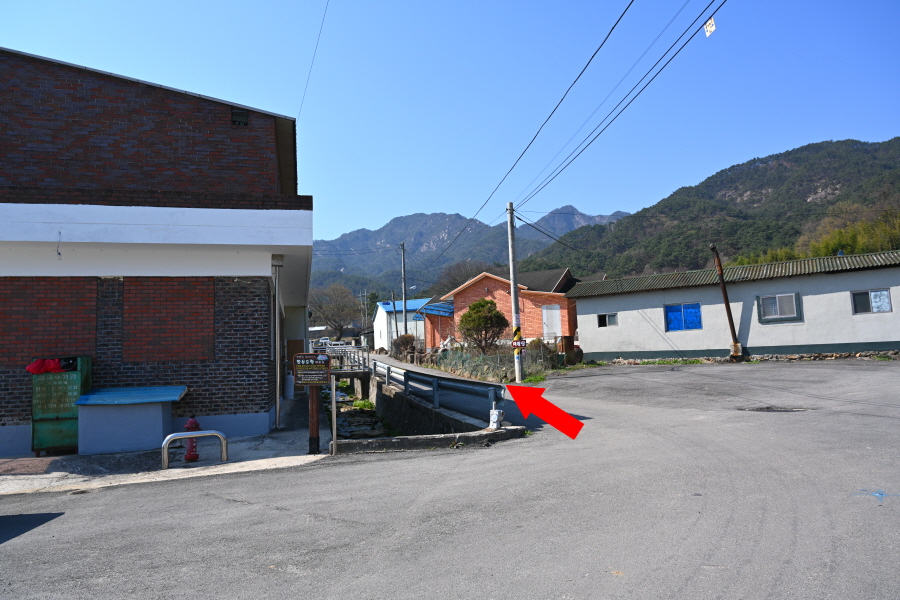 이번 산행은 매촌 저수지 옆 매촌 경로당에서 출발합니다. 경로당 뒤로 가야할 633m봉과 고리봉 정상이 보입니다. 경로당 오른쪽으로 도랑을 끼고 난 마을길에 매월당 안내판을 따라 갑니다.