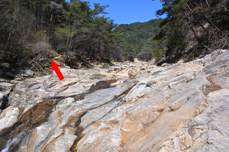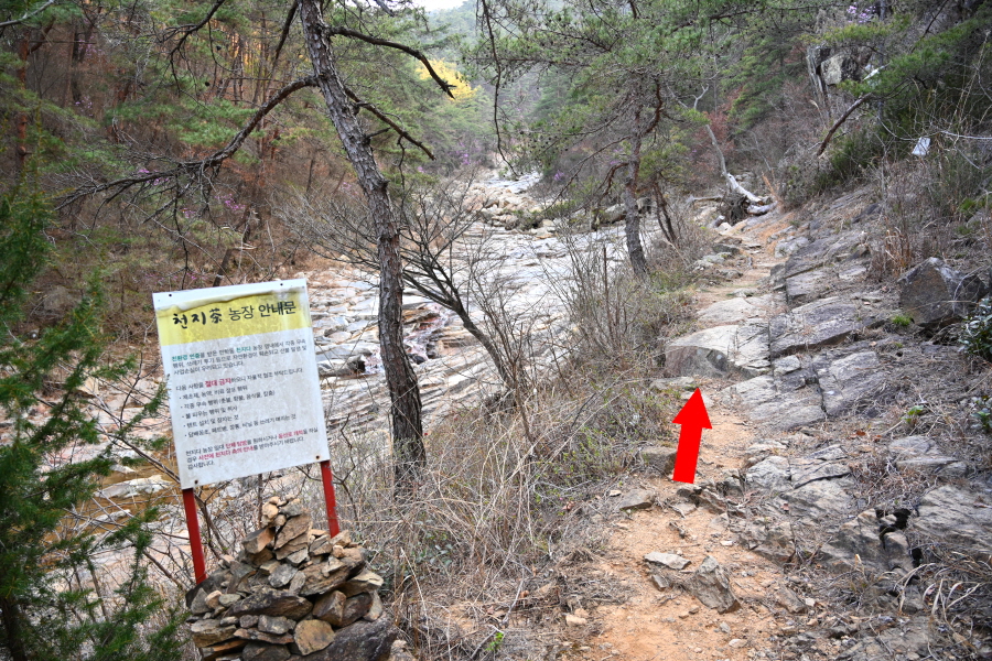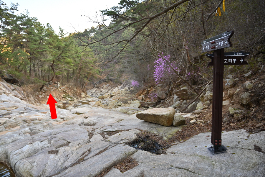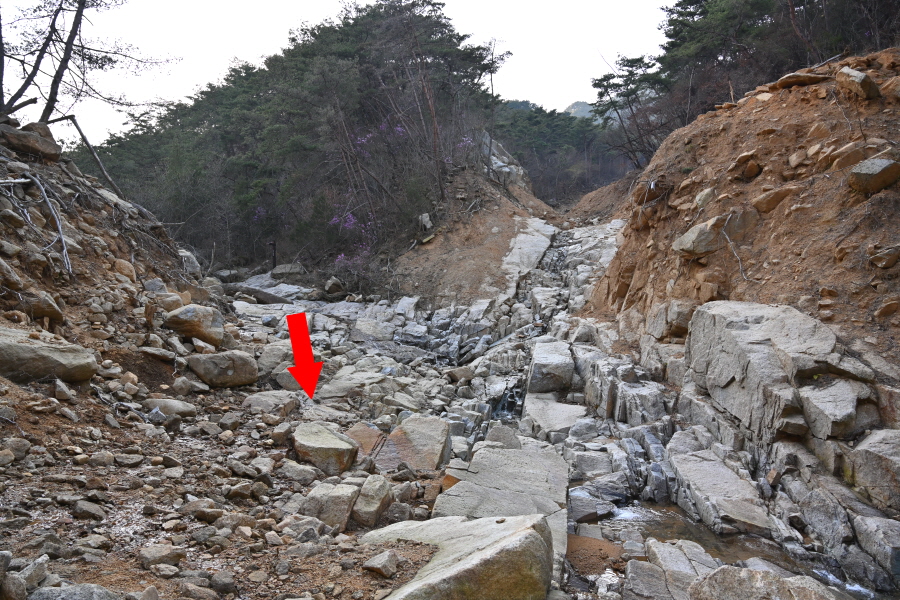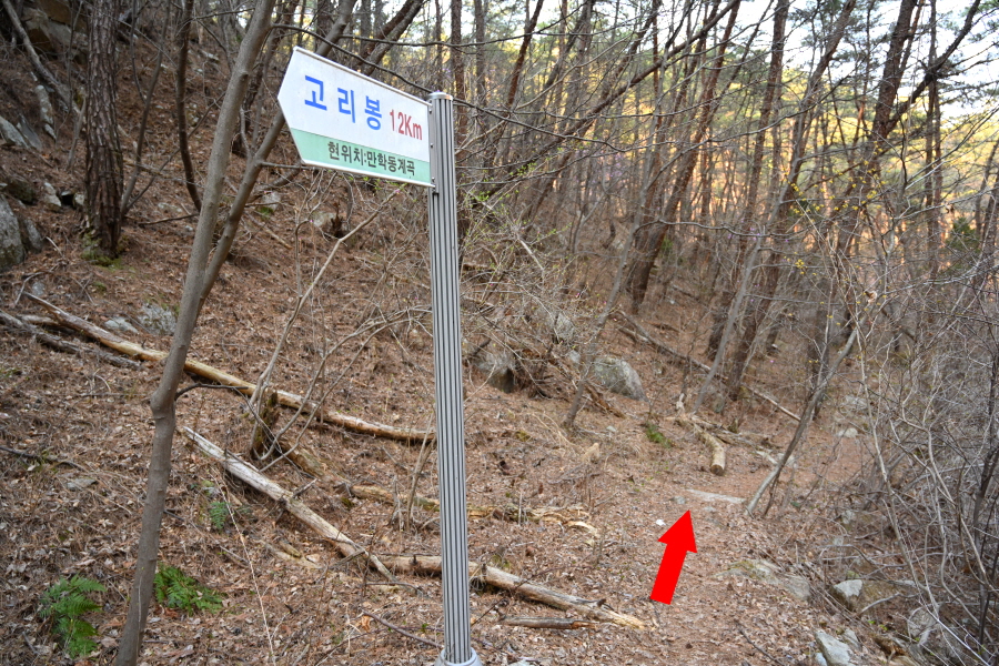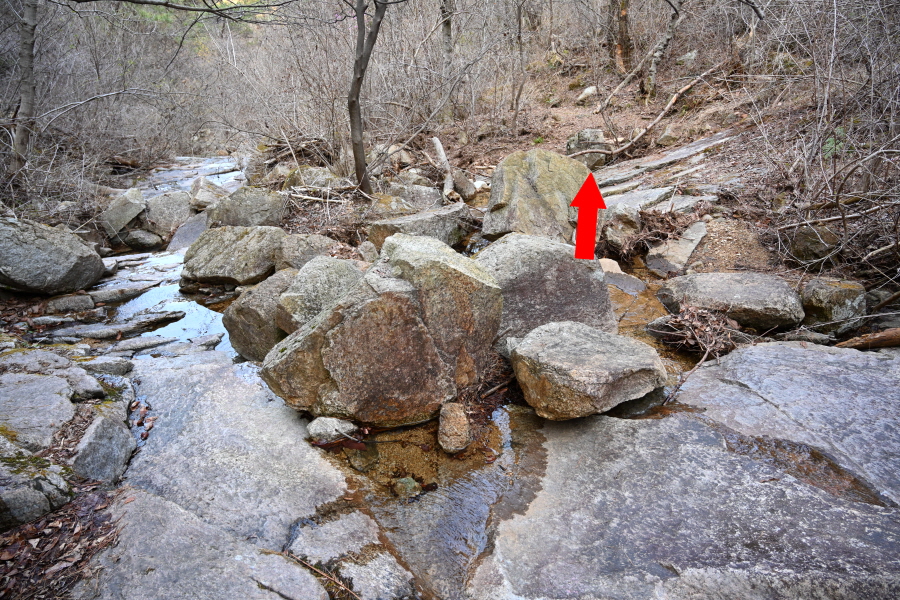 북사면의 가파른 길은 물 마른 계곡을 건너갔다 건너옵니다. 산악회 안내 리본과 이정표를 참고합니다.