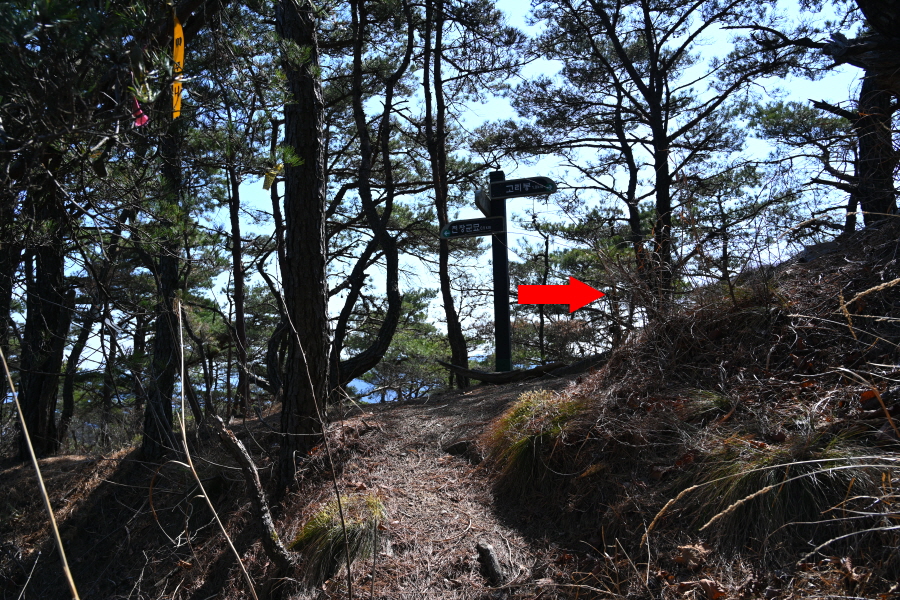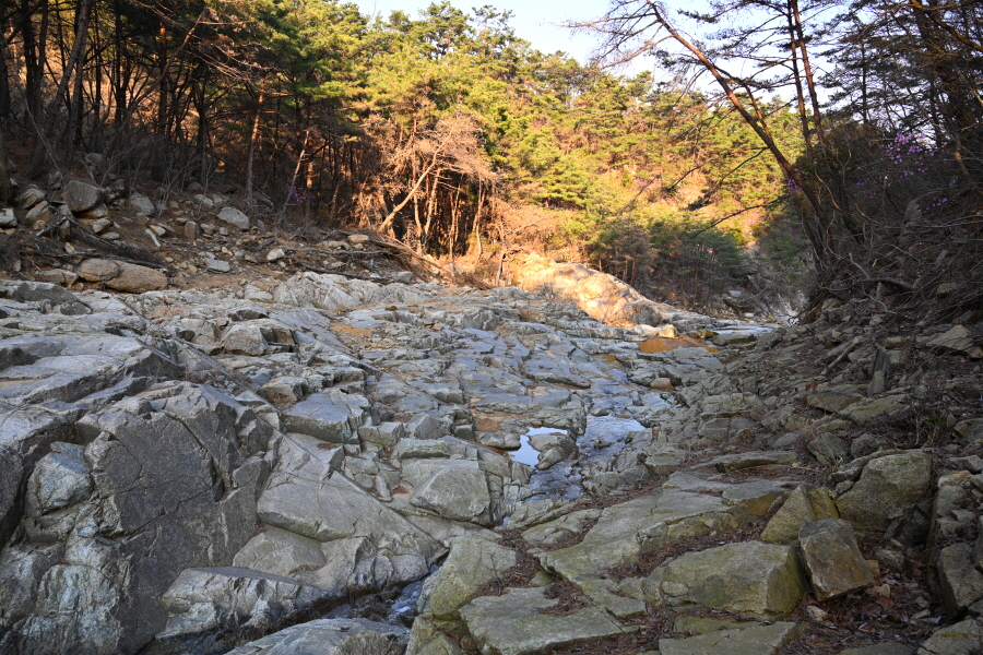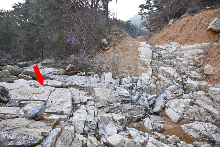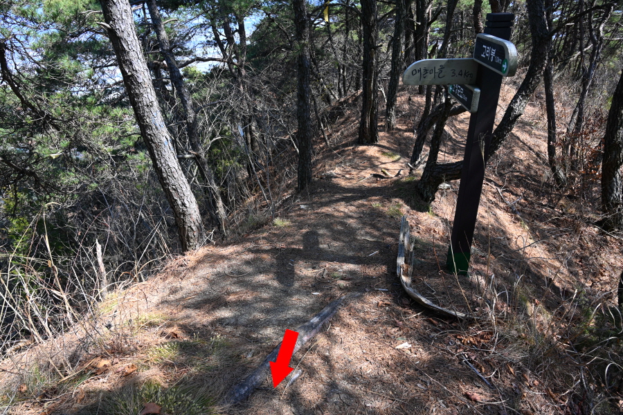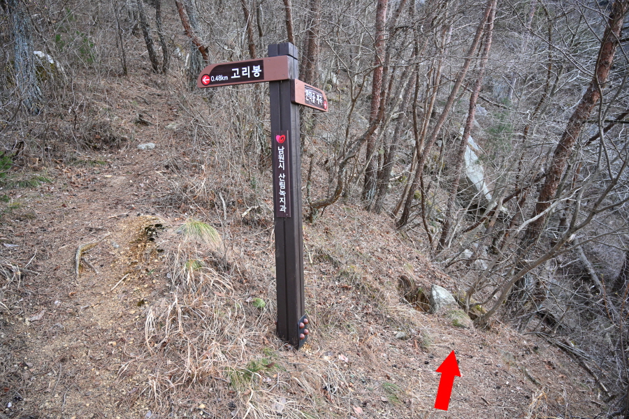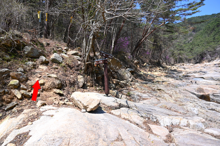 북사면의 가파른 길은 물 마른 계곡을 건너갔다 건너옵니다. 산악회 안내 리본과 이정표를 참고합니다.