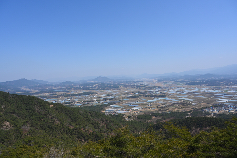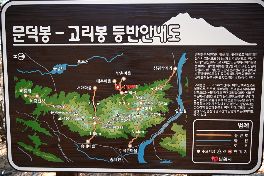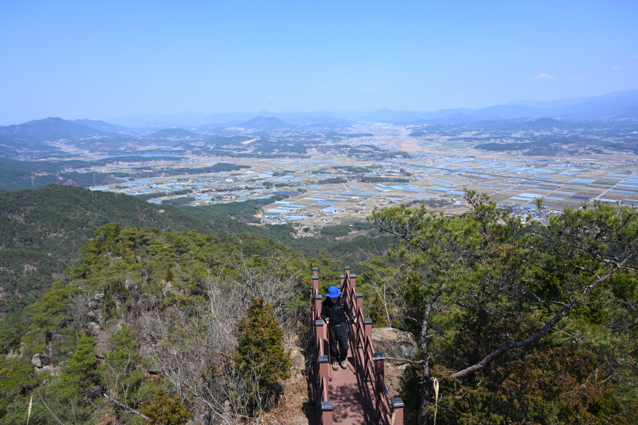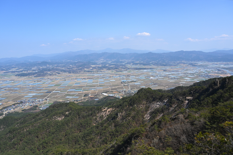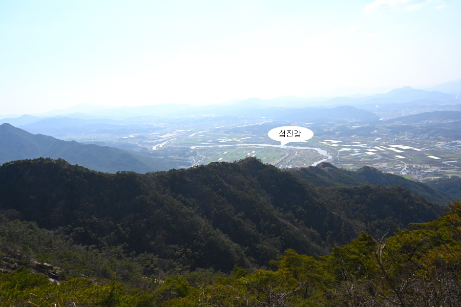 발아래는 북동쪽으로 남원시내와 백두대간 능선인 고남산과 수정봉, 금지면 들판이, 남서쪽으로는 S자로 굽어 도는 섬진강이 고리봉과 동악산을 휘감으며 흐릅니다.