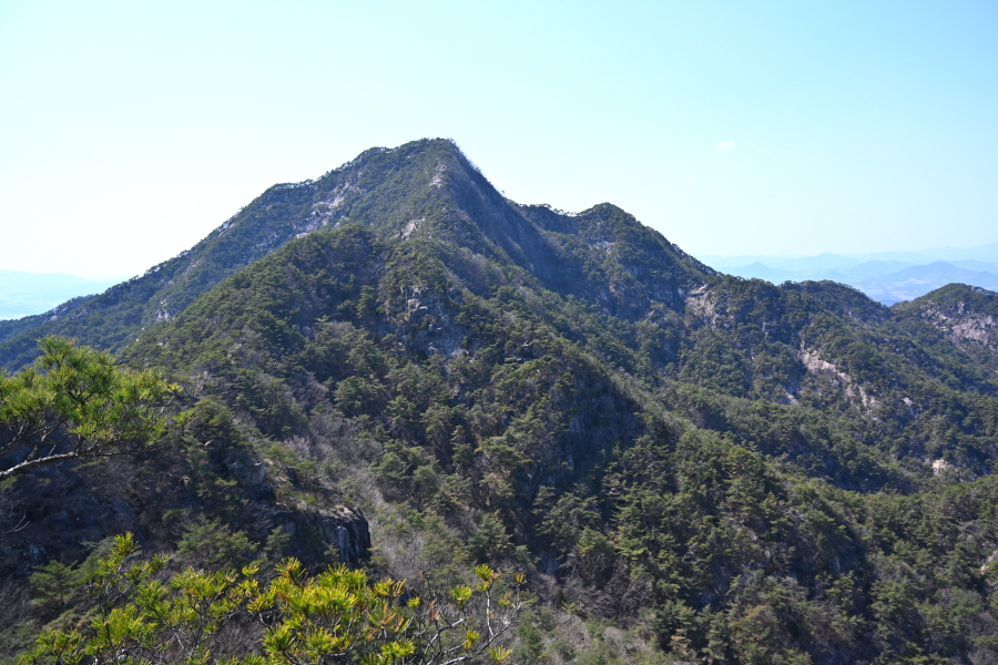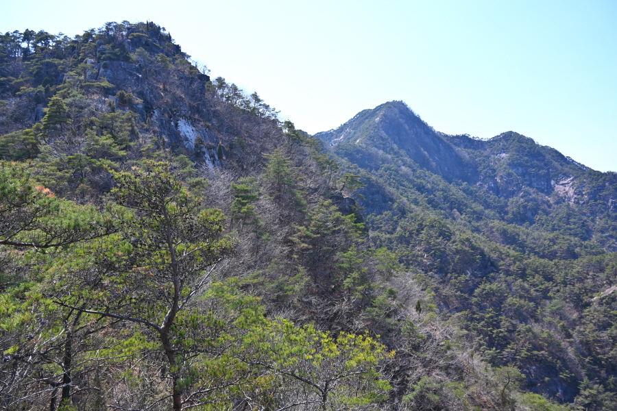 정면은 633m봉이며, 오른쪽으로 고리봉을 지나 울퉁불퉁한 근육질의 바위 능선이 삿갓봉까지 이어집니다.