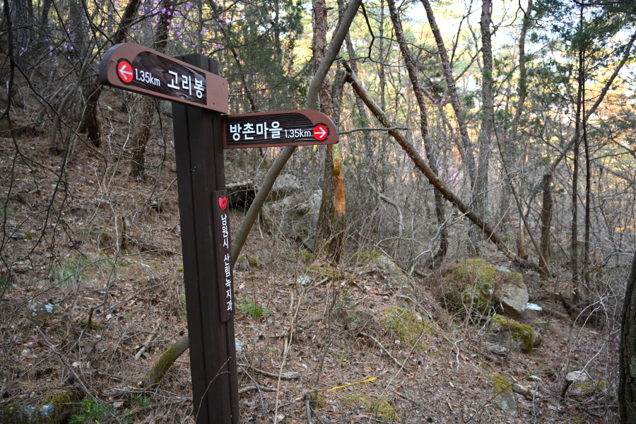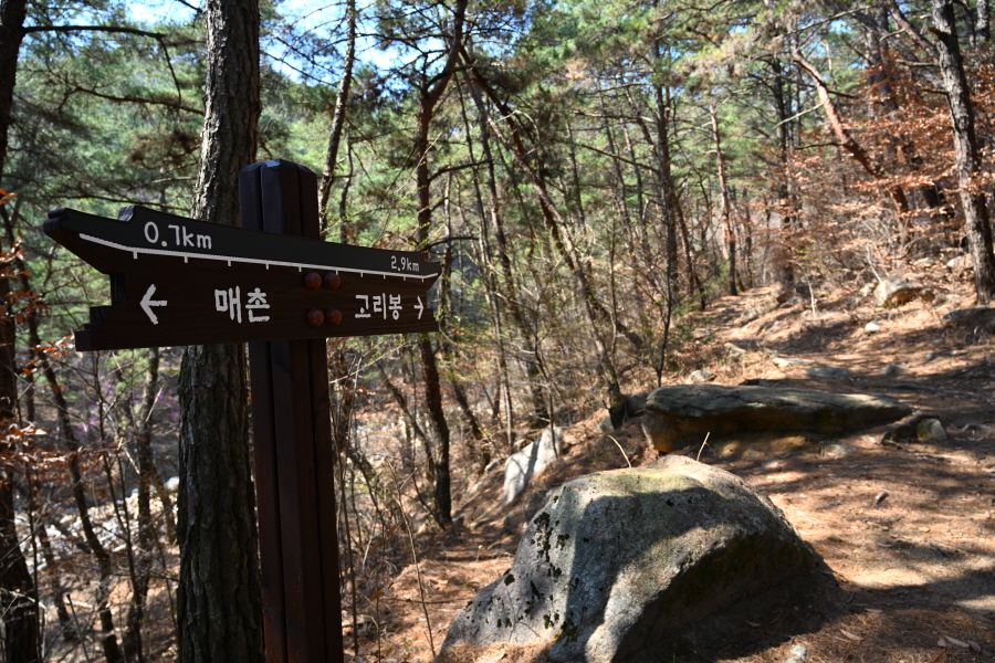 매촌 경로당에서 15분이면 본격적인 산행이 시작됩니다. 소나무 숲에 문덕봉~고리봉 등산 안내도를 확인한 뒤 ‘고리봉 2.9㎞’ 이정표를 지납니다.