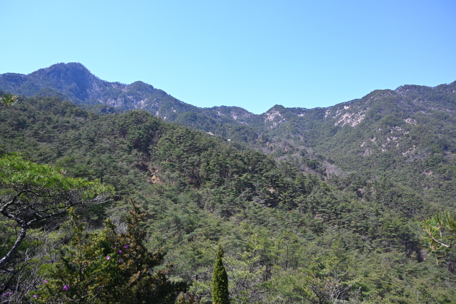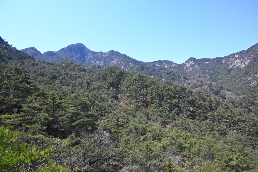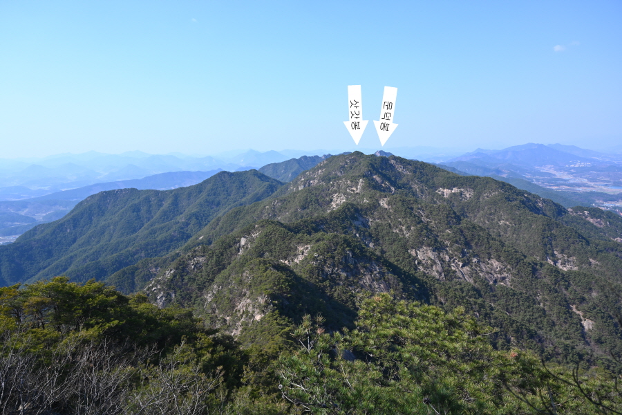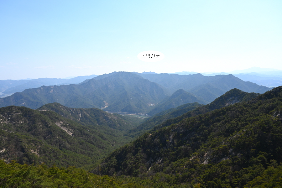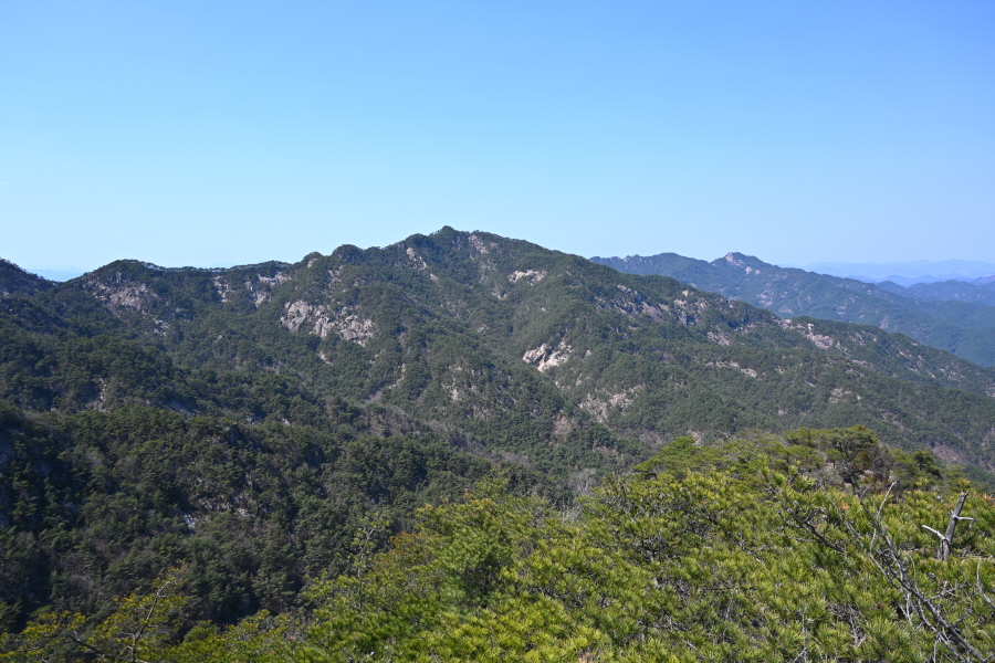 정상석 오른쪽은 약수정사 방향. 북쪽은 그럭재와 문덕봉 방향인데, 울퉁불퉁한 바위능선이 공룡 등처럼 꿈틀댑니다.