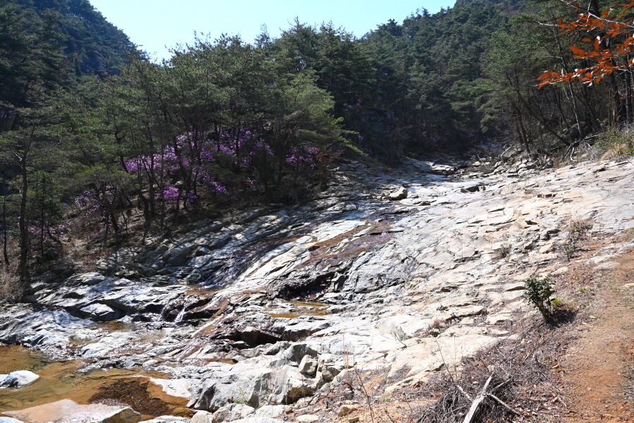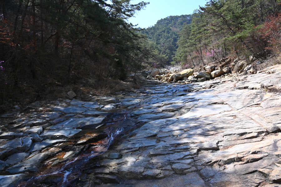 계곡을 왼쪽으로 끼고 갑니다. 하얀 암반이 드러난 만학골은 햇빛에 눈이 부십니다.