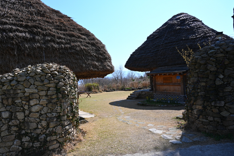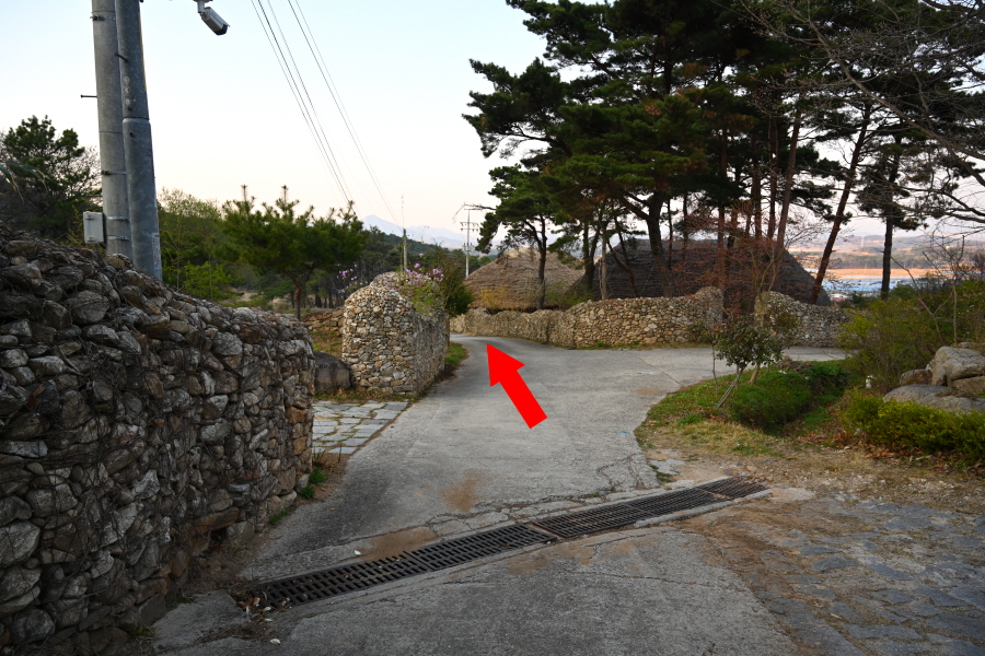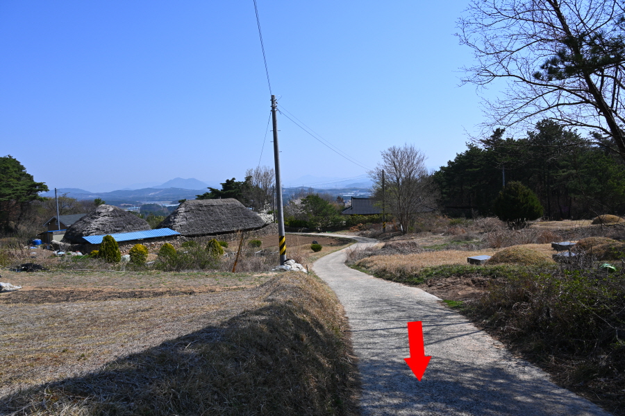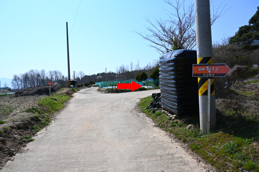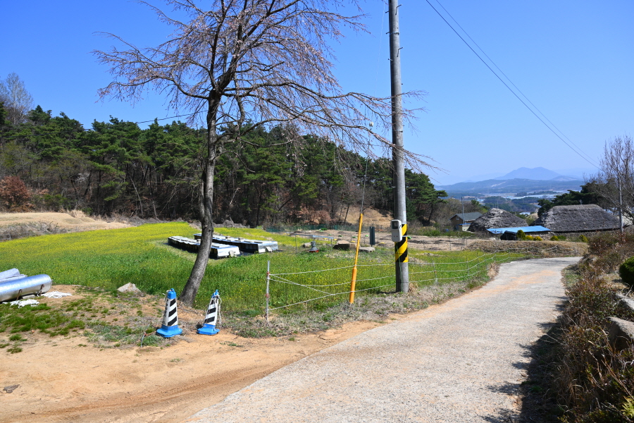 큰 느티나무를 지나 창고 앞에서 왼쪽으로 틀면 갈림길입니다. 매월당 방향인 오른쪽으로 꺾습니다. 돌담에 억새를 이은 초가집인 매월당 찻집을 지나 양봉장에서 마을길은 끝납니다.