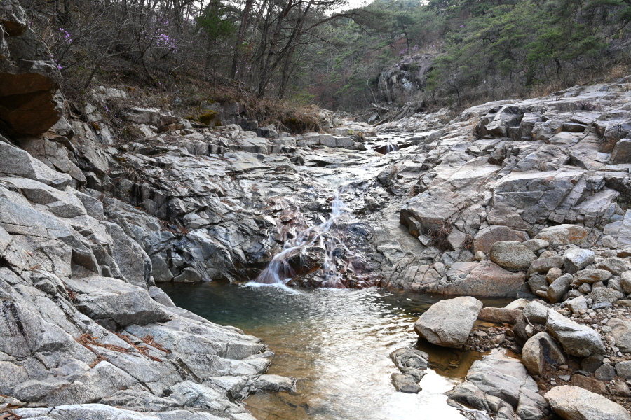 이제부터 계곡을 내려갑니다. 하얀 비단을 펼친 듯한 암반 계류를 따라 만학골 갈림길에서 왔던 길을 되짚어 30분이면 매촌 경로당에 도착 합니다