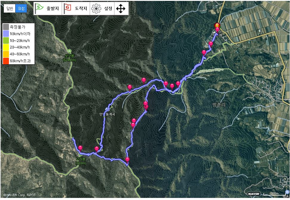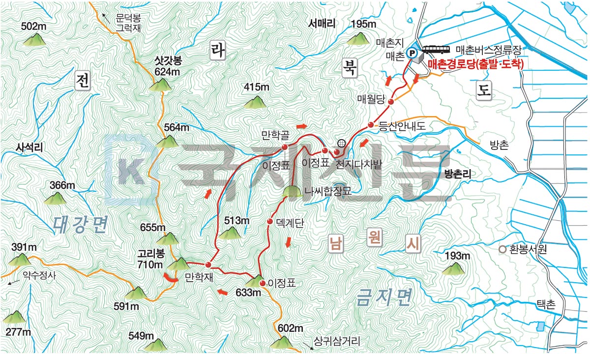 남원군 금지면 서매리 매촌경로당을 출발해 매월당 찻집~등산안내도~차밭~만학골(능선과 계곡 방향 고리봉 갈림길)~고리봉·천장군묘 갈림길(633m봉)~만학재~고리봉 정상~만학재~계곡 합수점~만학골(능선과 계곡 방향 고리봉 갈림길)~매월당 찻집~매촌경로당으로 되돌아오는 원점회귀입니다. 산행거리는 약 6.5㎞이며, 4시간 30분 안팎이 걸립니다.