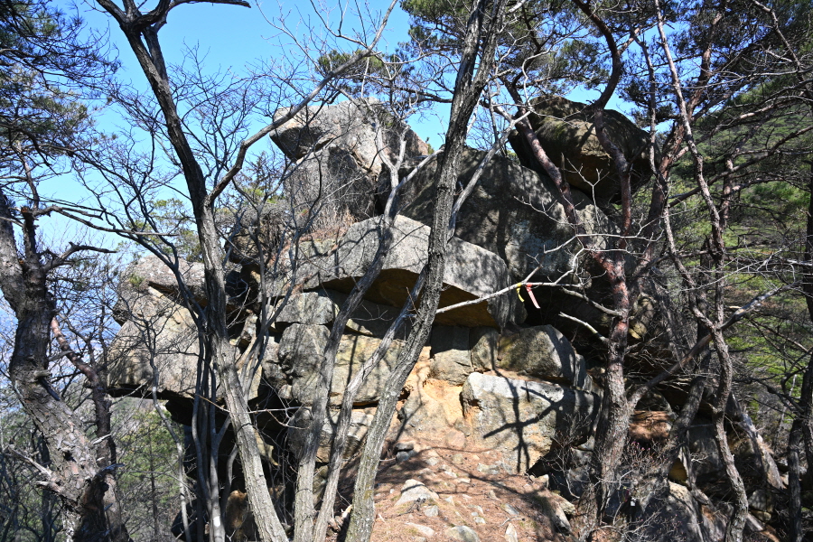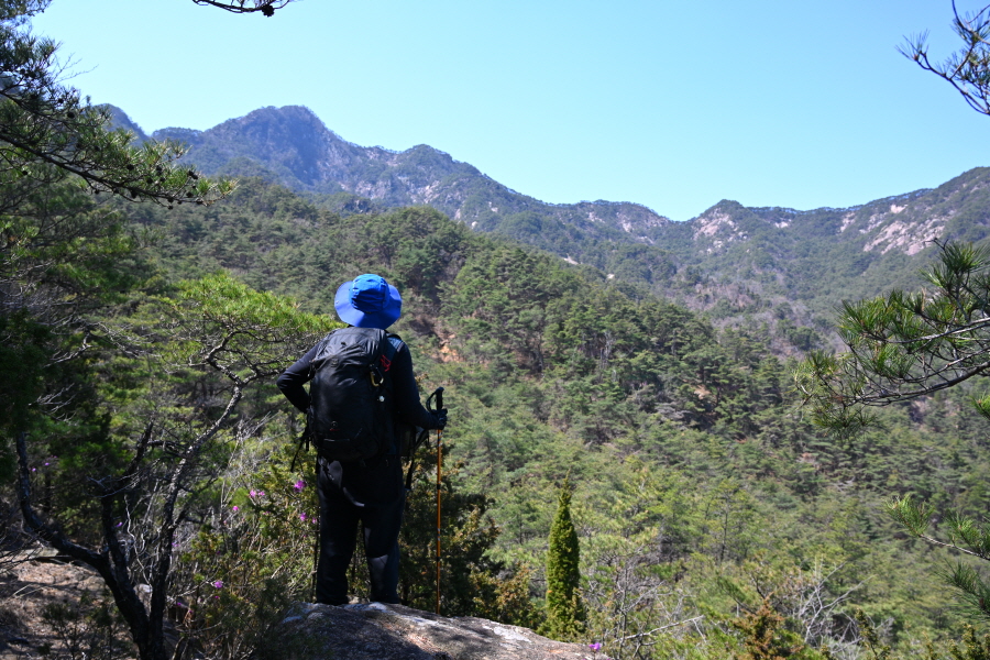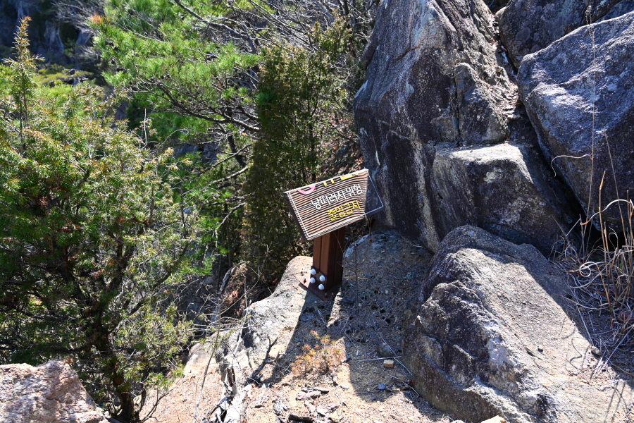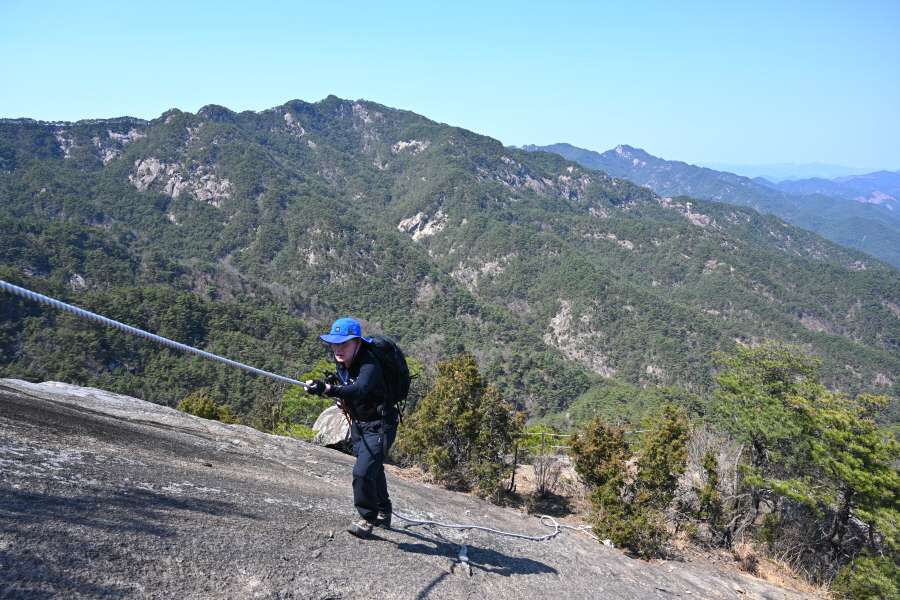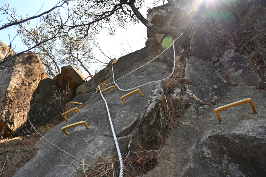 산비탈 길은 묵은 묘에서 능선을 탑니다. 30분이면 손잡이와 발판 겸용인 ㄷ자 구조물이 박힌 첫 번째 바위를 올라서면 전망대에 섭니다.