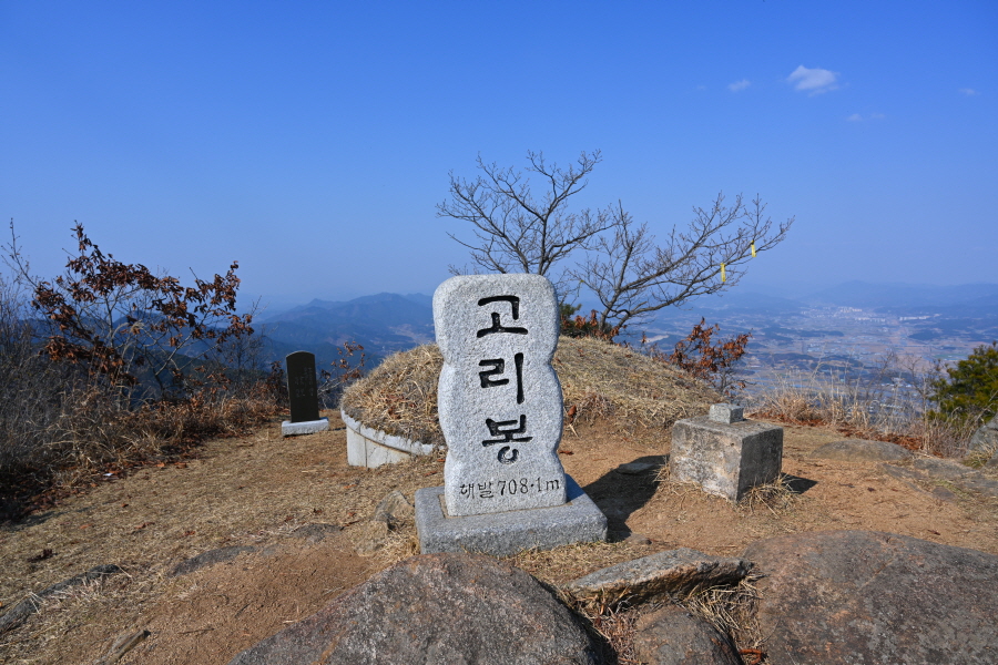 봉분이 큰 경주김씨 합장묘 뒤로 삼각점과 고리봉 정상석이 있습니다.