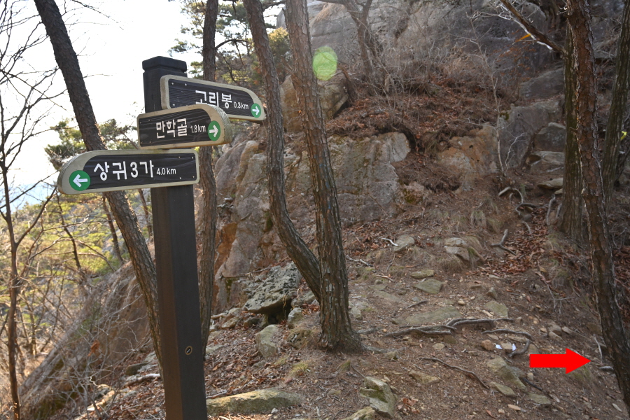 경사진 바위에 로프를 잡고 오릅니다. 바윗길도 나타나고 ㄷ자 구조물이 연달아 박힌 바위를 지나 만학골 이정표 갈림길에서 약 1시간 20분이면 633m봉 갈림길에 도착합니다. 오른쪽 고리봉(1.0㎞)으로 갑니다. 왼쪽은 천장군묘 방향.