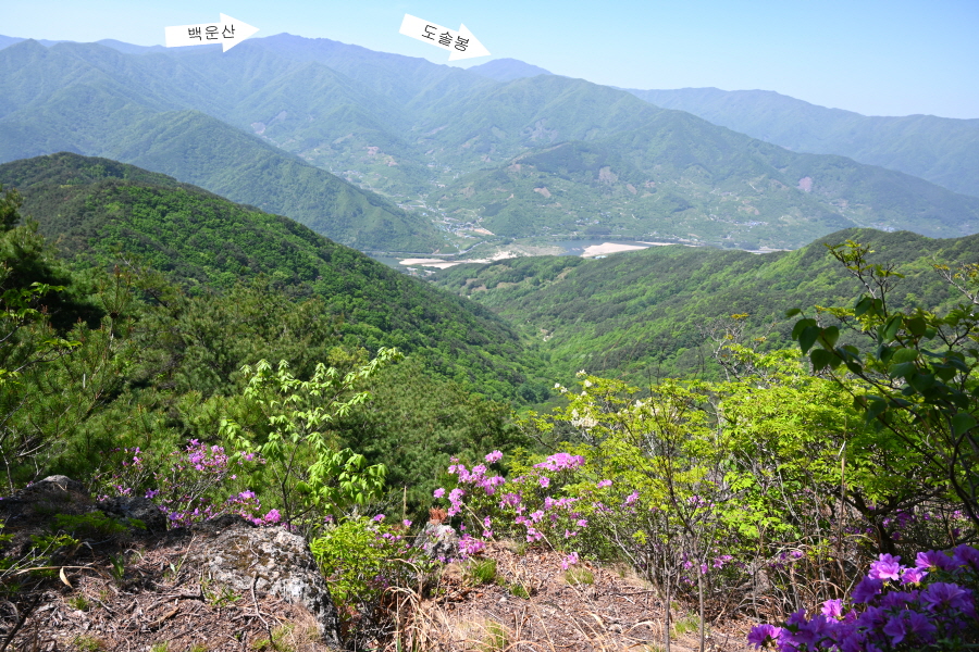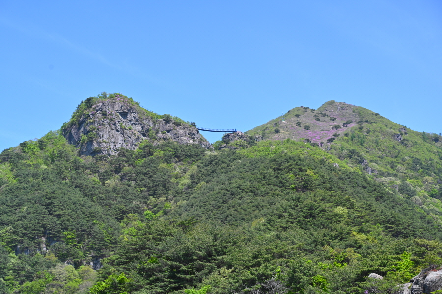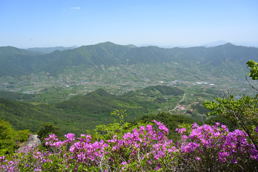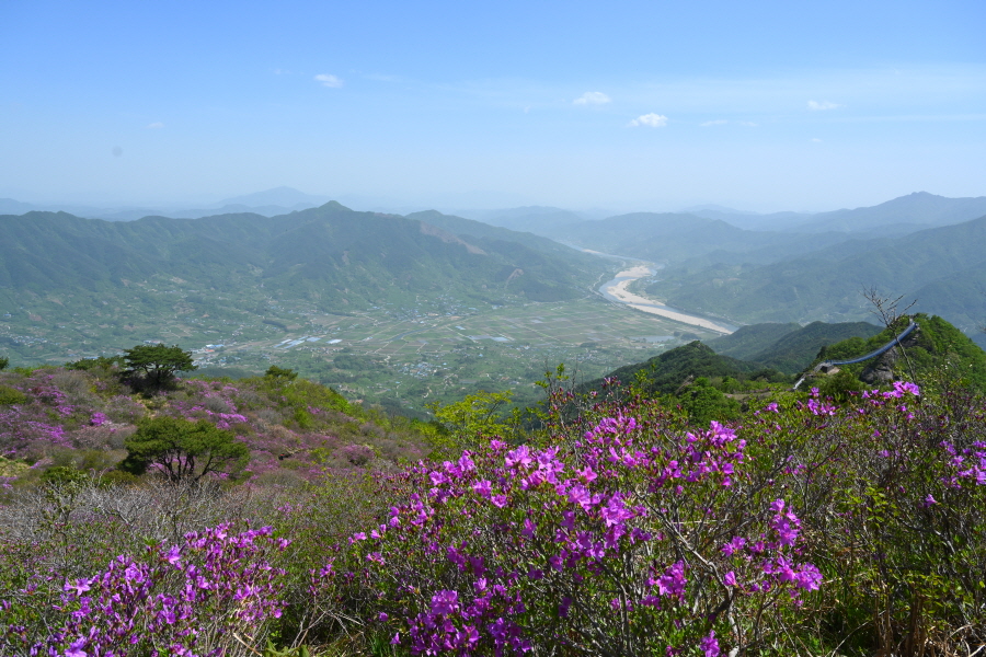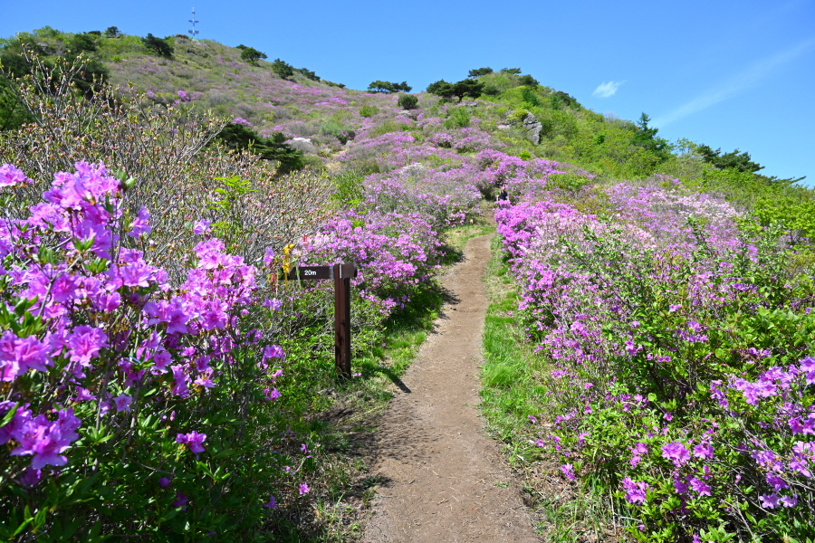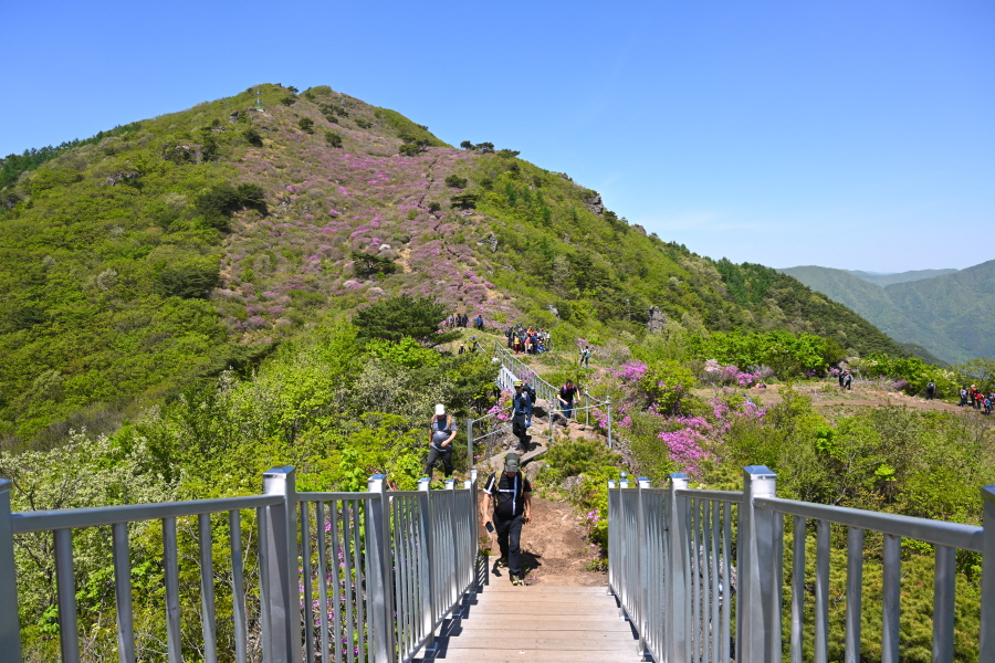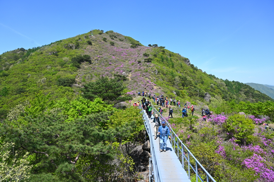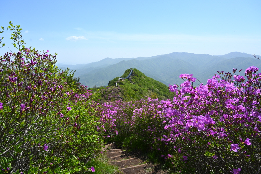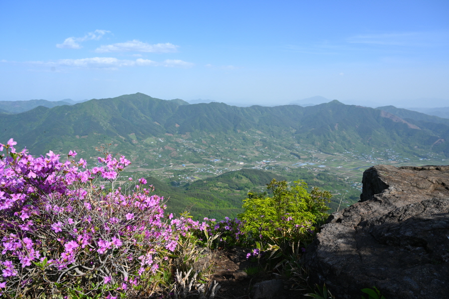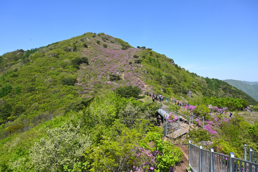 1054m봉 산비탈을 가득 메운 약 5만 ㎡ 철쭉군락은 일부만 꽃이 폈습니다. 이번 주에 만개할 것으로 보입니다.
