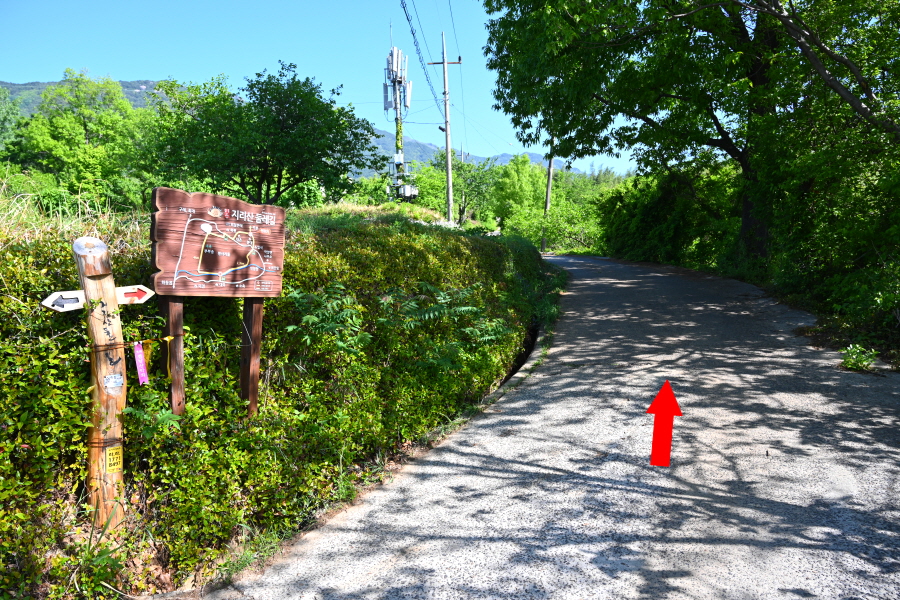 이번 산행은 입석마을회관에서 출발합니다. 윗재까지는 지리산둘레길 이정표의 붉은색 화살표 방향입니다. 형제봉 주막 왼쪽 마을길을 올라갑니다. 정면 멀리 가야할 형제봉과 신선대 구름다리, 정상부의 철쭉 군락은 아직 이른지 붉은 빛만 감돕니다.