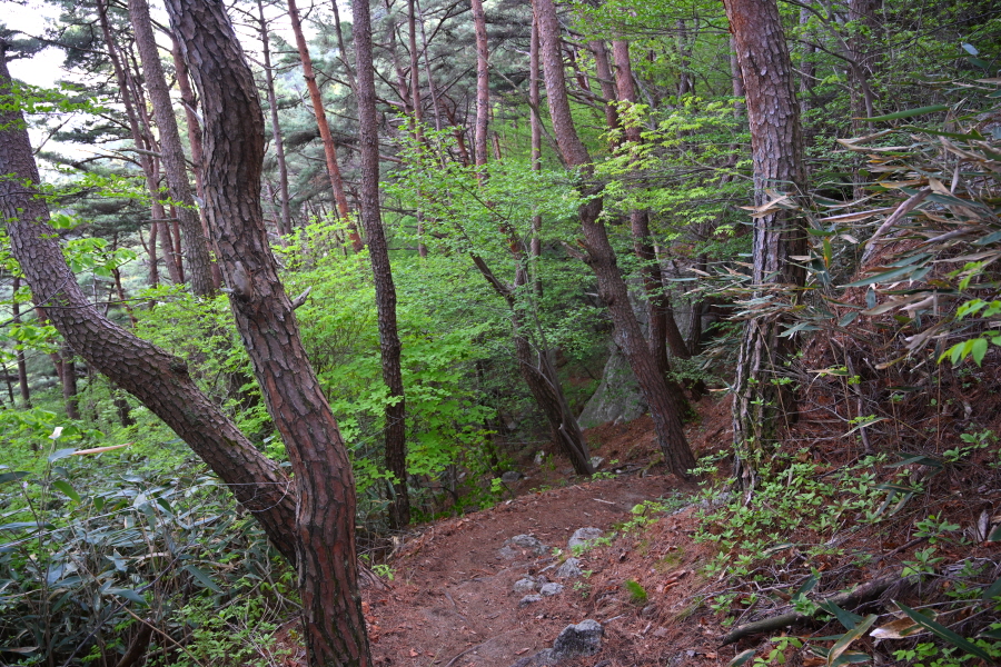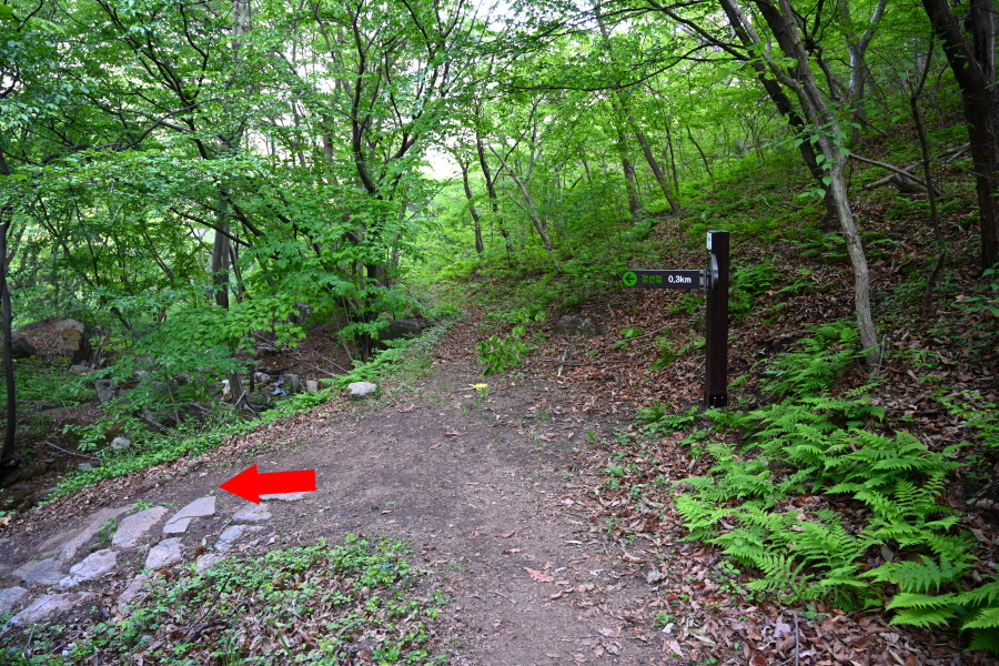 여기서 100m 즈음 더 가 나오는 갈림길에서 왼쪽 원부춘 방향으로 콘크리트 임도를 벗어납니다. 본격적인 산길입니다.