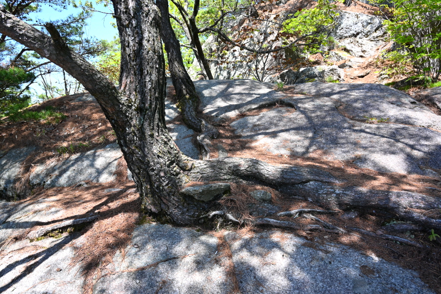 바위를 타면 암반에 뿌리를 내린 소나무에서 동쪽으로 조망이 열립니다.
