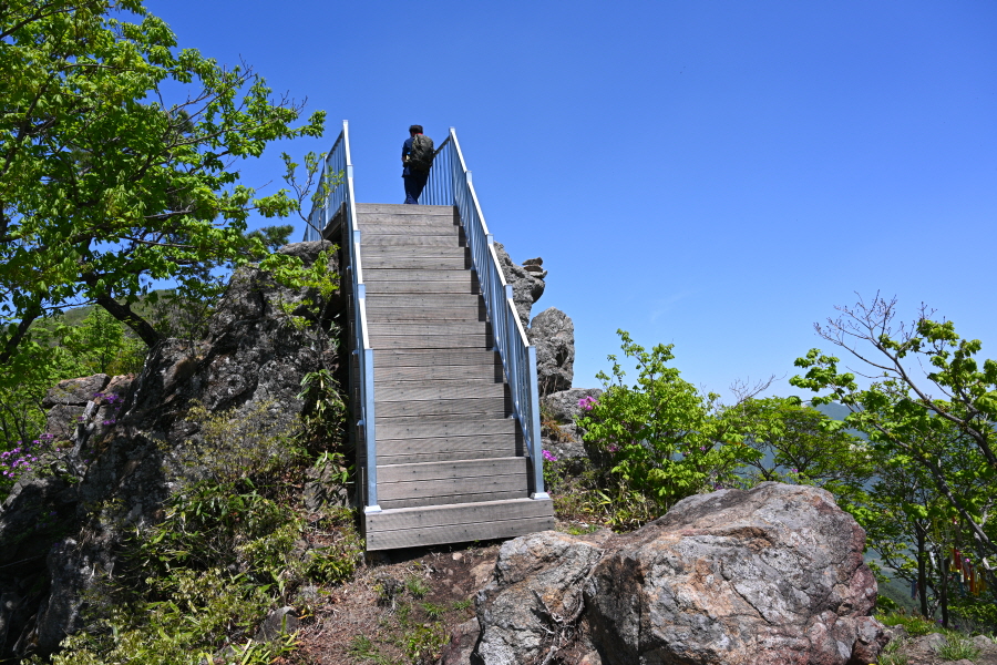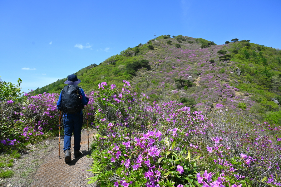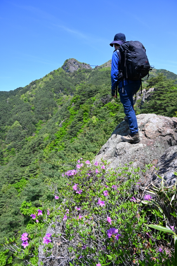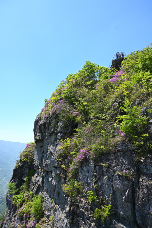 철쭉꽃이 흐드러지게 핀 바위 벼랑을 돌아 윗재에서 약 1시간 10분이면 신선대에 올라섭니다.