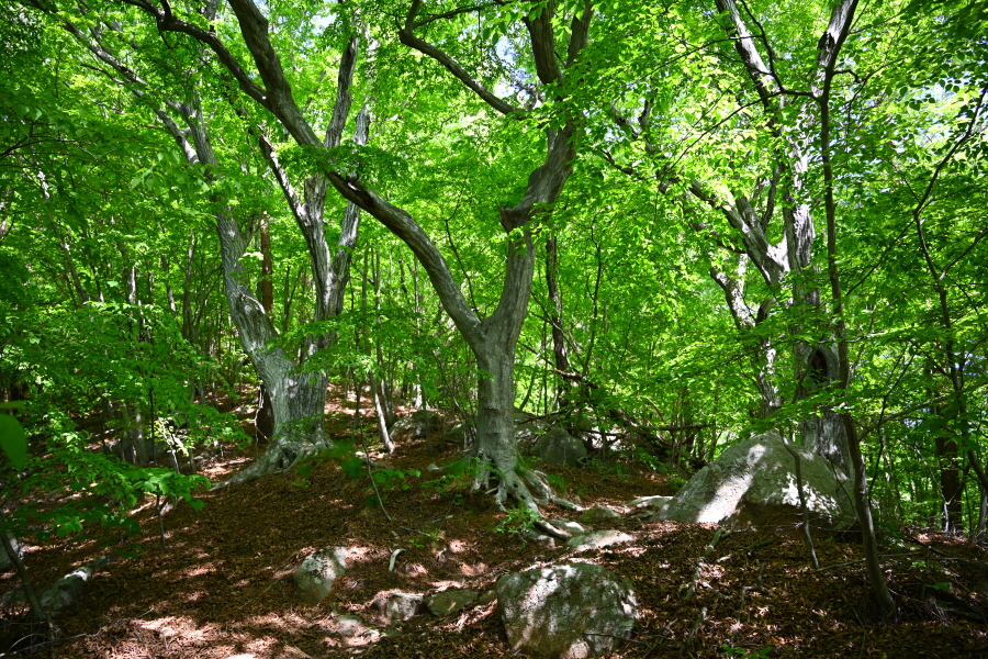 콘크리트 임도는 가팔라집니다. 약 15분이면 댓숲의 화장실을 지나 큰 서어나무 두 그루가 정자나무 역할을 하는 쉼터에 도착합니다. 벤치와 평상이 놓여 형제봉을 보며 쉬어가기 좋습니다.