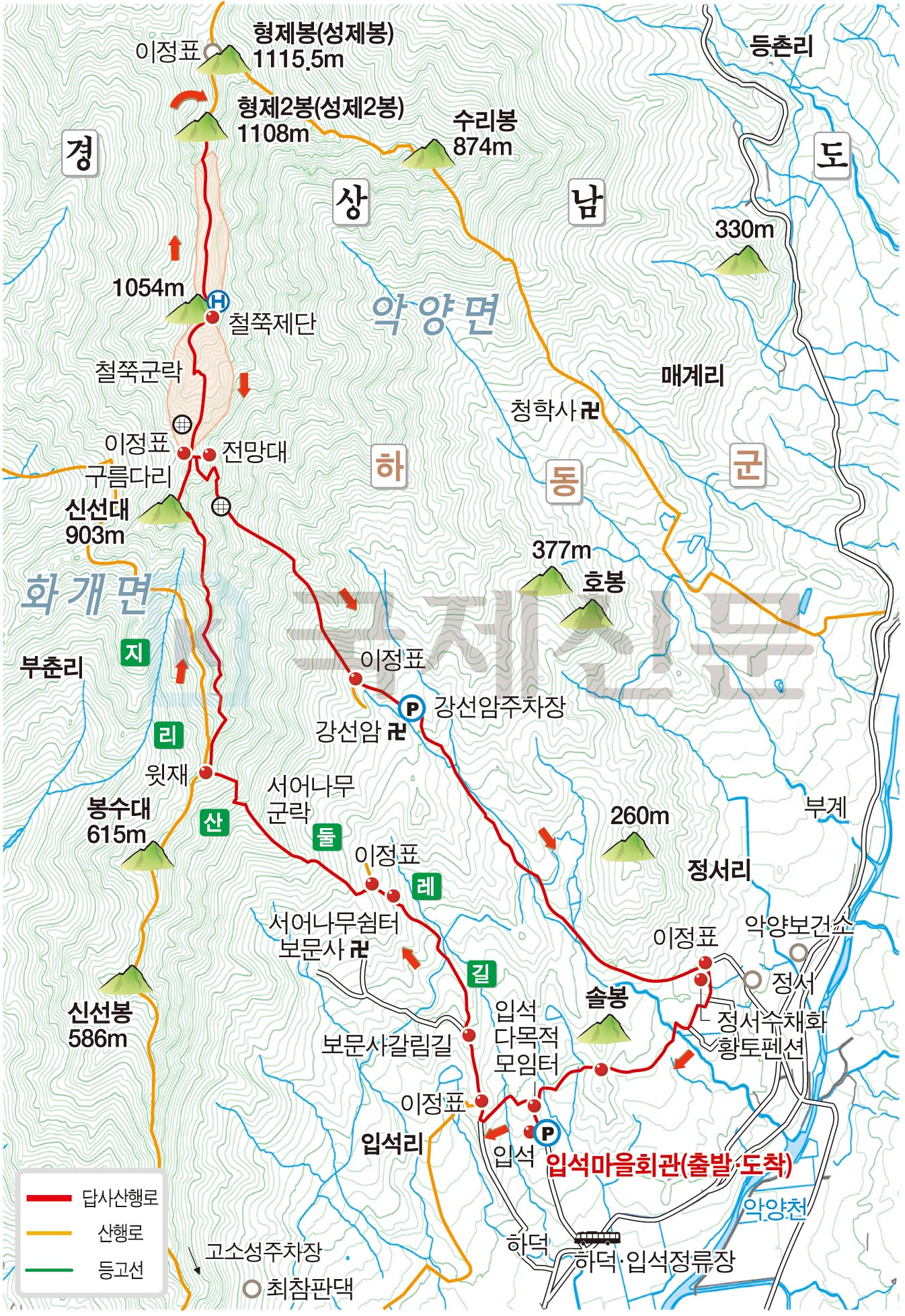 하동군 악양면 입석리 입석마을회관에서 지리산둘레길~입석 다목적 모임 터 옆 갈림길~토지길 1코스·지리산둘레길 갈림길~보문사 갈림길~서어나무 쉼터~윗재~신선대~구름다리~강선암 갈림길~철쭉군락~철쭉제단(헬기장)~형제2봉 정상~강선암 갈림길~강선암 주차장~정서수채화황토펜션 앞 갈림길(토지길 1코스 합류)~입석 다목적 모임터 옆 갈림길~입석마을회관으로 되돌아오는 원점회귀입니다. 산행거리는 약 12㎞이며, 6시간 안팎이 걸립니다.