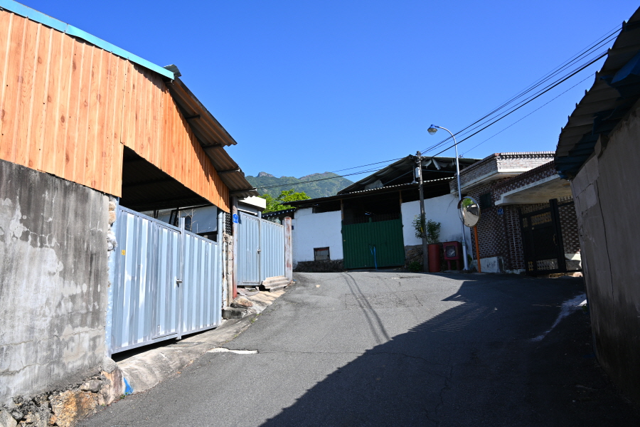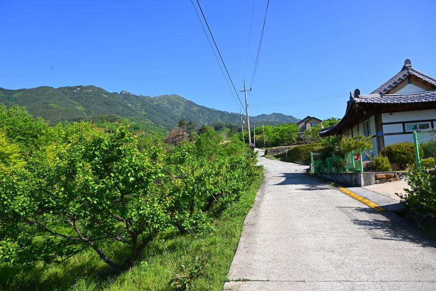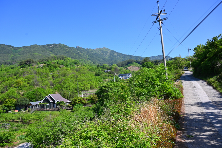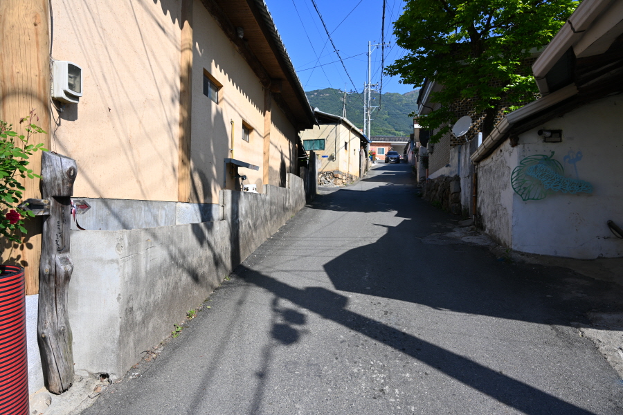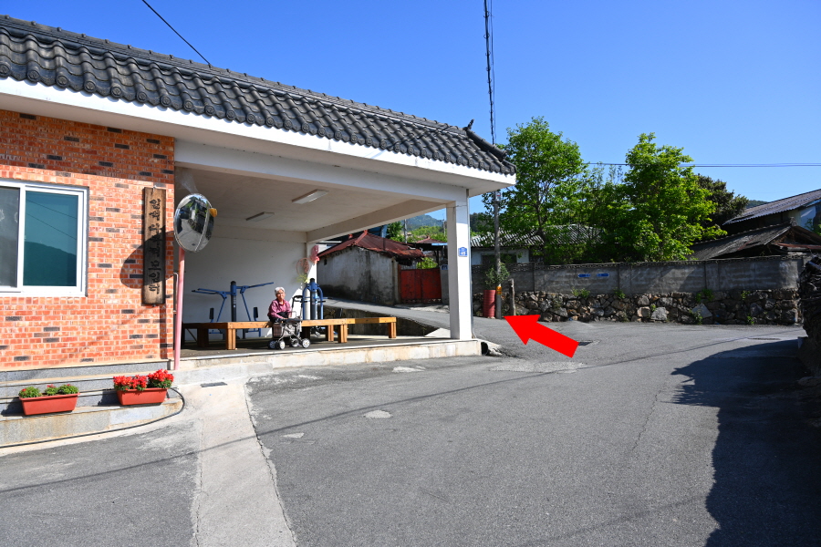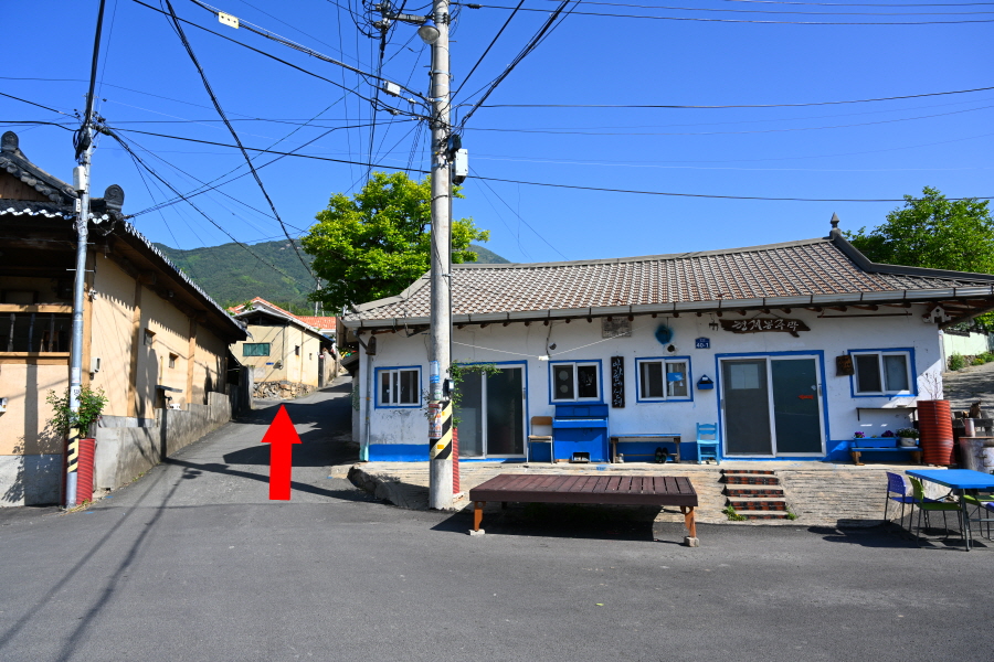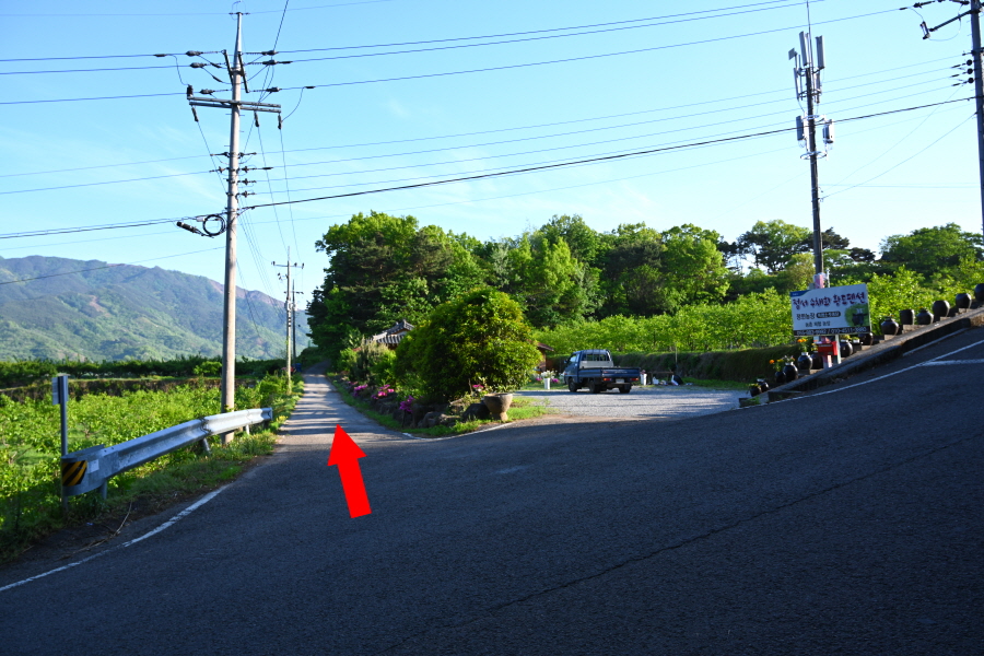 도로를 따라 약 25분 더 내려 간 뒤 정서수채화황토펜션 앞 갈림길에서 오른쪽으로 꺾어 토지길 1코스인 최참판댁으로 향합니다.