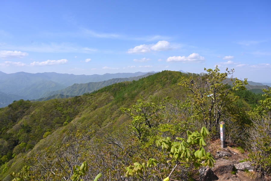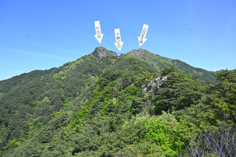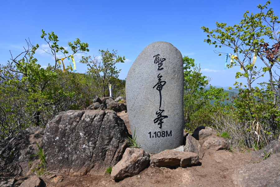완만한 능선을 따라 15분이면 두 개의 정상에서 먼저 만나는 성제봉(2봉·1108m)에 도착합니다.