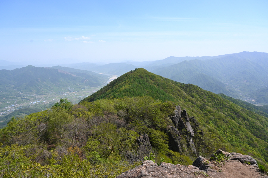 남쪽은 섬진강 뒤로 억불봉에서 백운산의 장쾌한 능선이 펼쳐진다면, 북쪽에는 두 귀를 쫑긋 세운 신선대와 1054m봉 사이에 구름다리가 걸렸습니다.