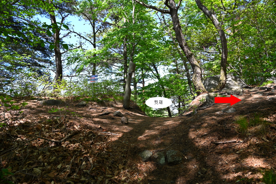 서어나무 쉼터에서 약 45분이면 사거리 안부인 윗재에 올라섭니다. 형제봉은 오른쪽 구름다리(1.1㎞) 방향으로 꺾어 능선을 탑니다. 직진은 원부춘으로 향하는 지리산둘레길이며, 왼쪽은 고소성 주차장에서 올라오는 길입니다.