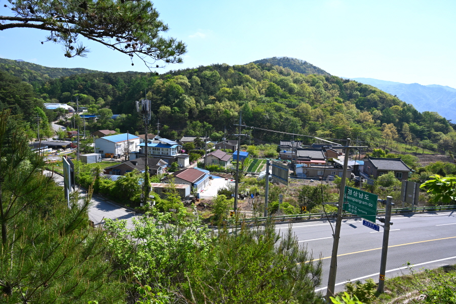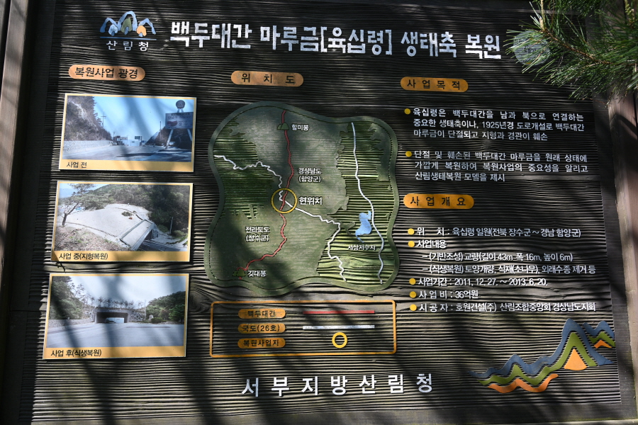 능선 오른쪽에 산간마을인 육십령마을이 보입니다. 길이 뚫리기 이전의 높이인 해발 710m로 복원한 생태터널 위를 지나 육십령마을(양봉 쉼터)에서 올라오는 산길과 만나 직진합니다.