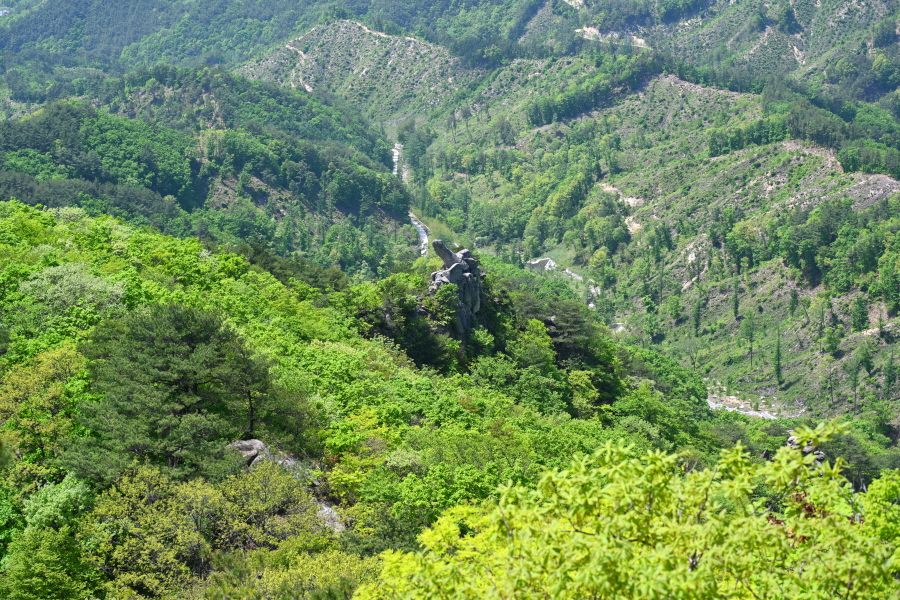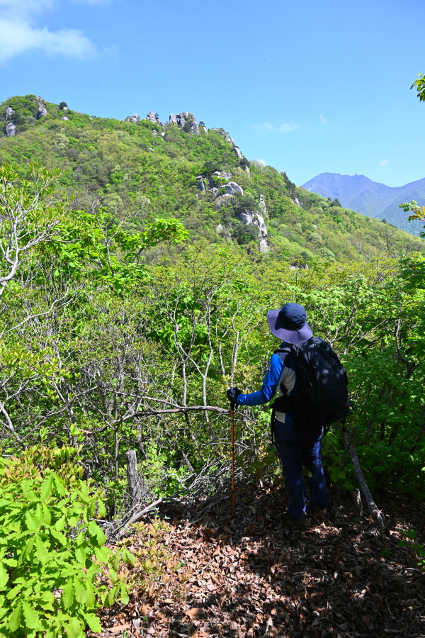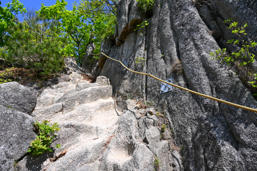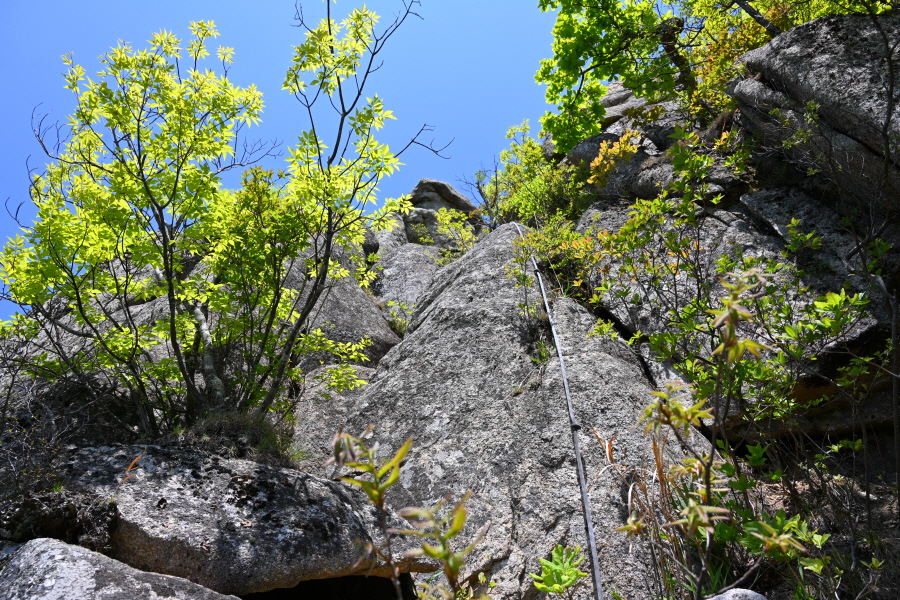 세 번째 암봉인 대문바위를 오르는 길은 암벽에 낡은 로프가 묶인데다 위험합니다. 또한 무리해서 올라가도 대문바위는 보이지 않습니다.