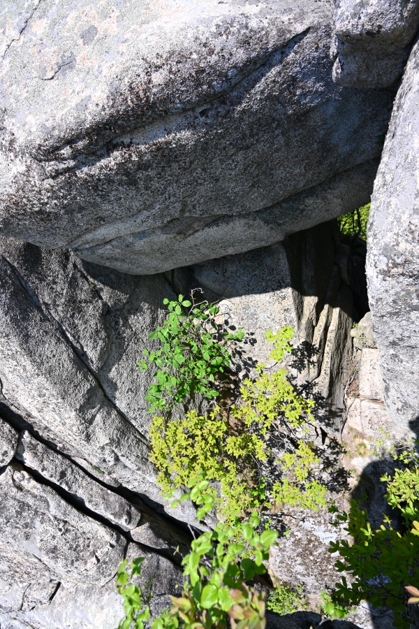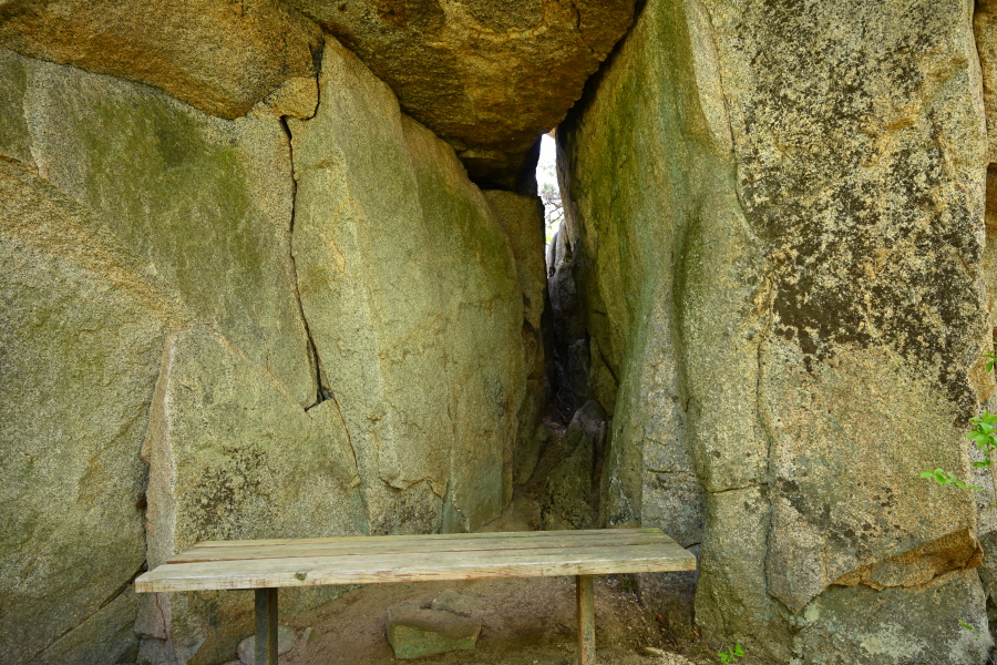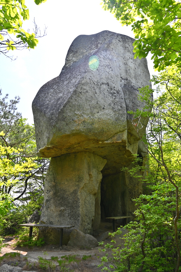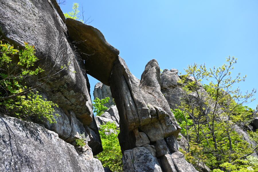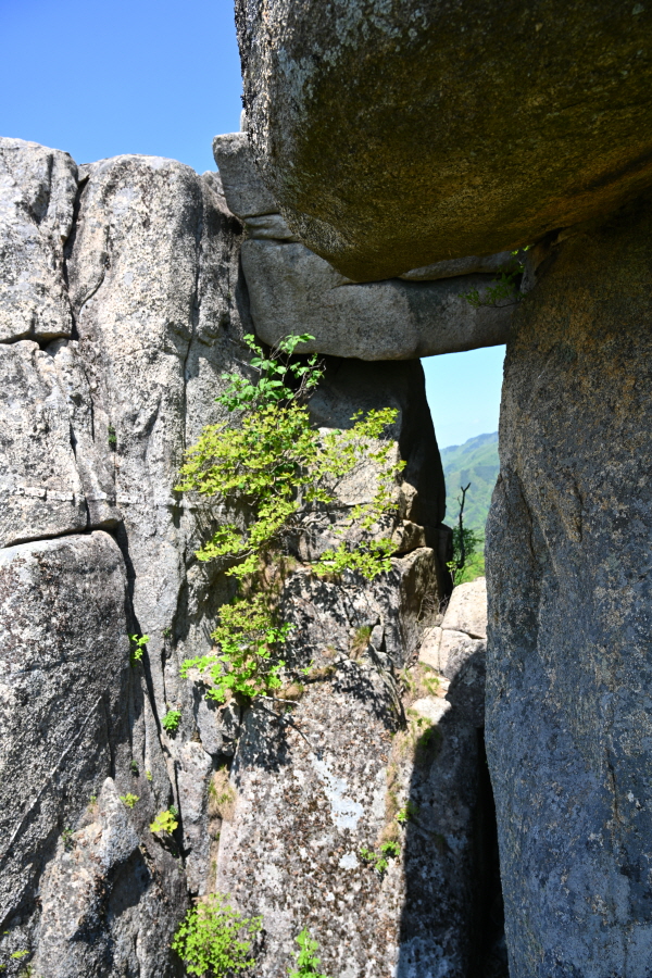 두 번째 암봉에 납작한 바위가 절묘하게 얹혀 생긴 쪽문으로 불리는 작은 대문바위에서 갈림길로 되돌아갑니다.