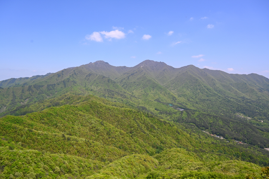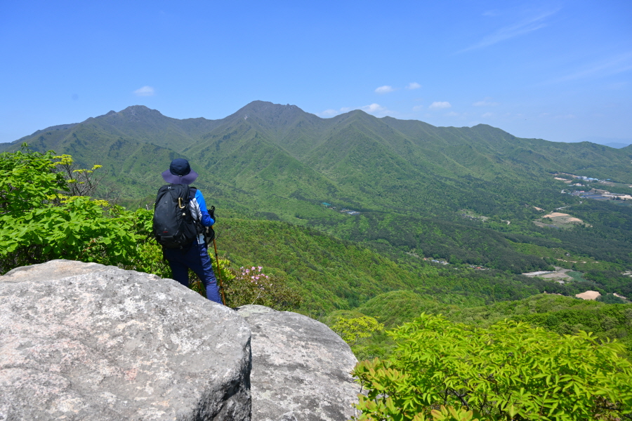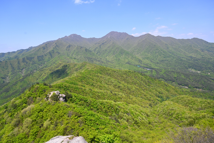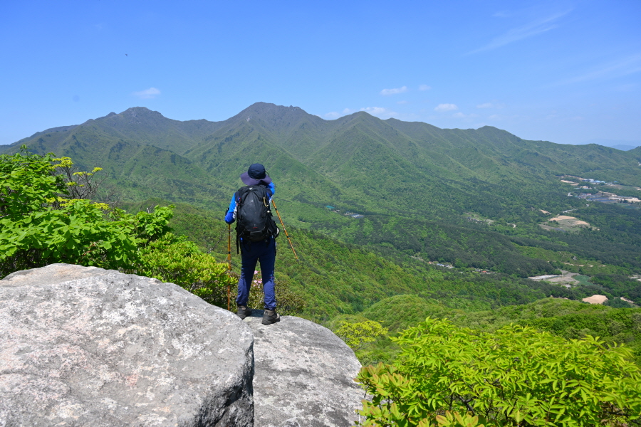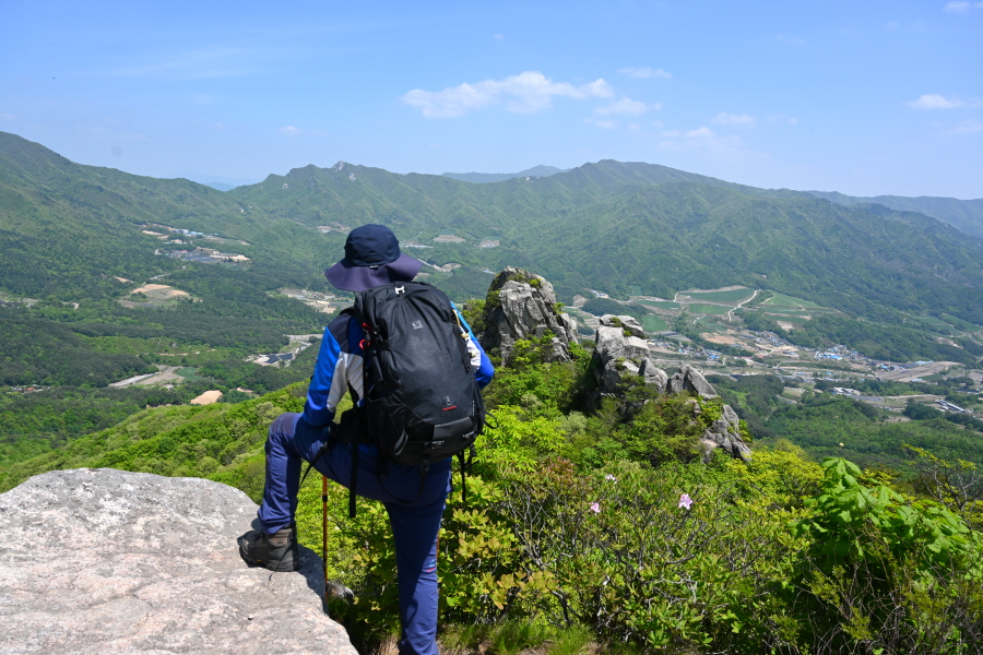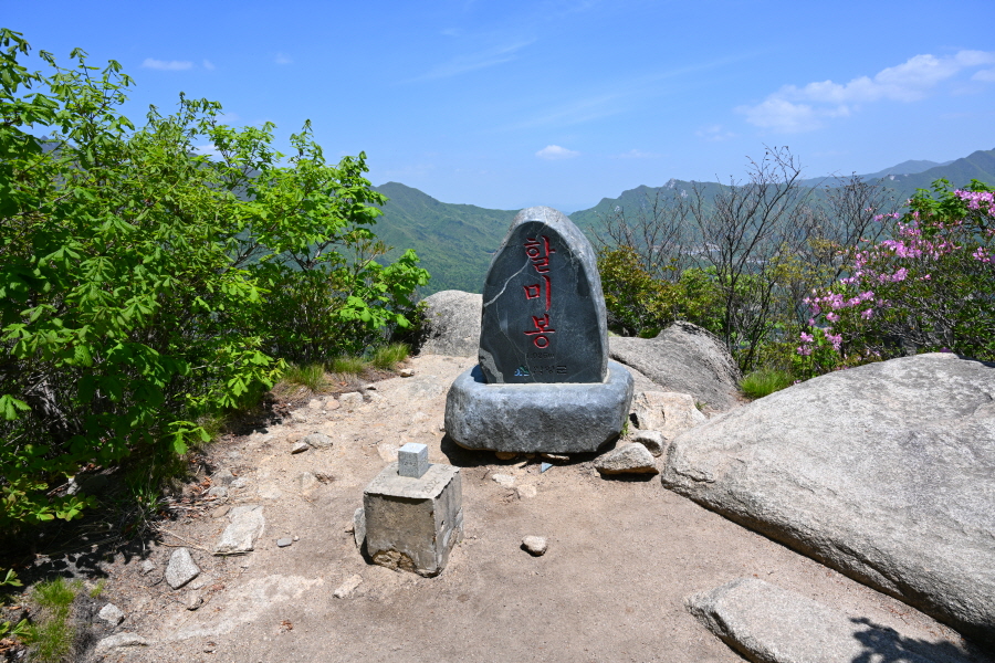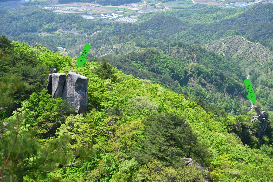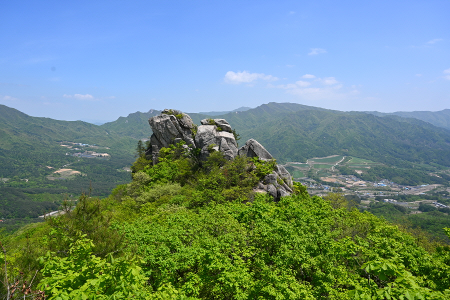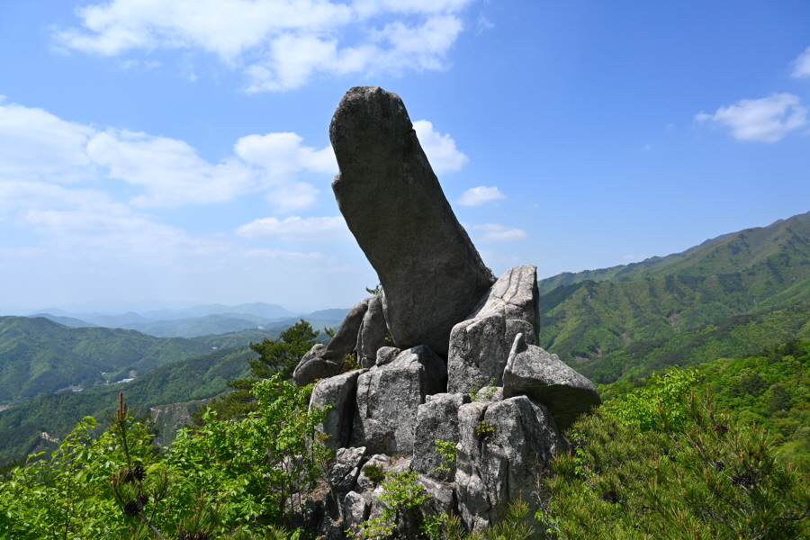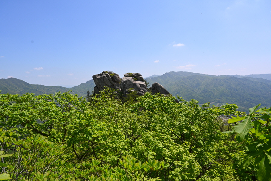 산성의 흔적인 석축을 올라 삼거리인 915m봉에서 직진합니다. 폐 헬기장을 지나면 할미봉과 세 개의 암봉이 줄지어선 삼형제바위 전망 장소가 나옵니다.