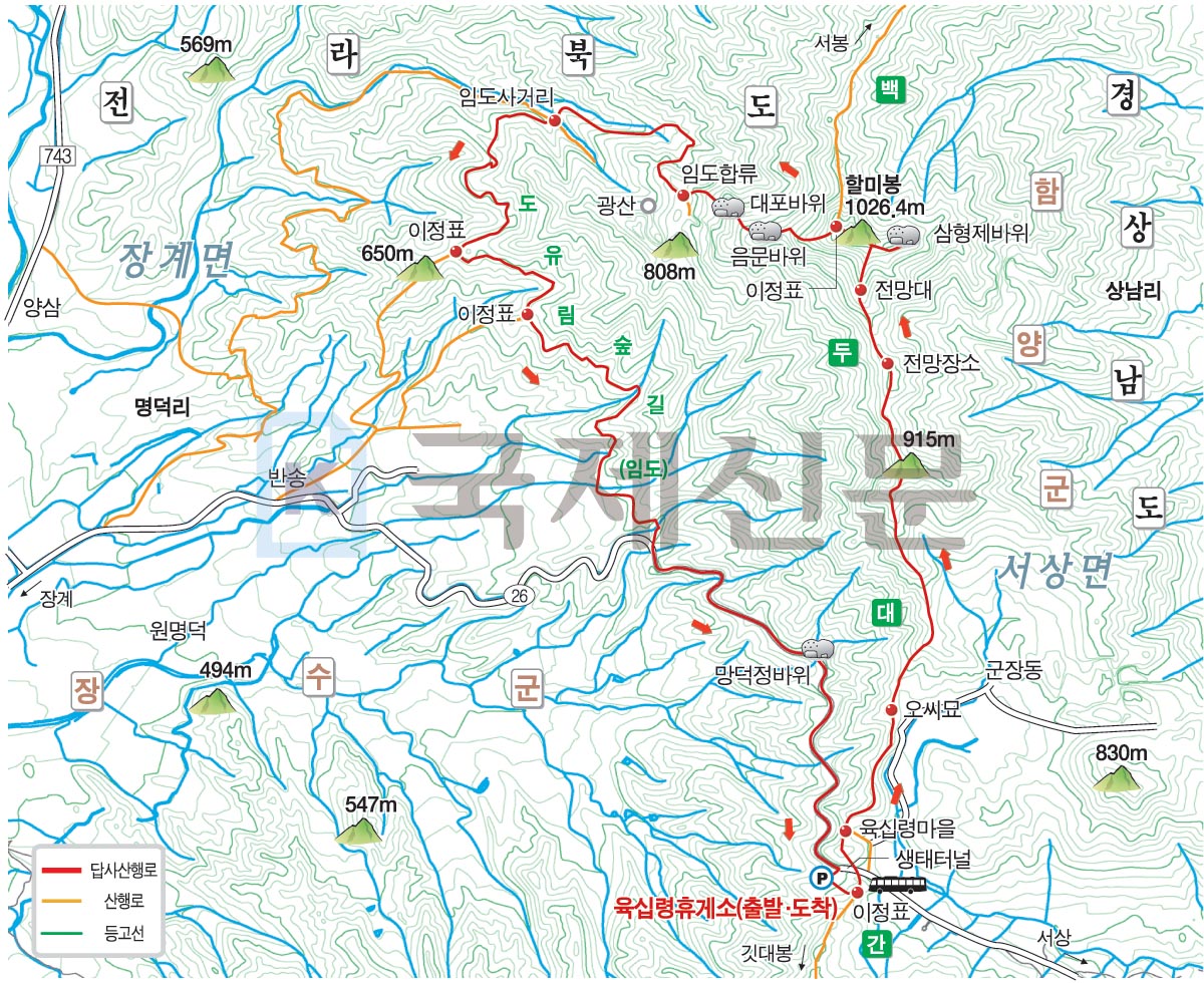 전북 장수군 장계면 명덕리 육십령휴게소를 출발해 백두대간 능선~915m봉~삼형제봉 갈림길~삼형제봉~삼형제봉 갈림길~할미봉 정상~반송마을·서봉 갈림길~음문바위~대포바위~임도 갈림길~임도 사거리~도유림 숲길에서 두 번의 산책로 갈림길~26번 도로~망덕정 바위~육십령휴게소로 되돌아오는 원점회귀입니다. 산행 거리는 약 8.5㎞이며, 4시간 안팎이 걸립니다.