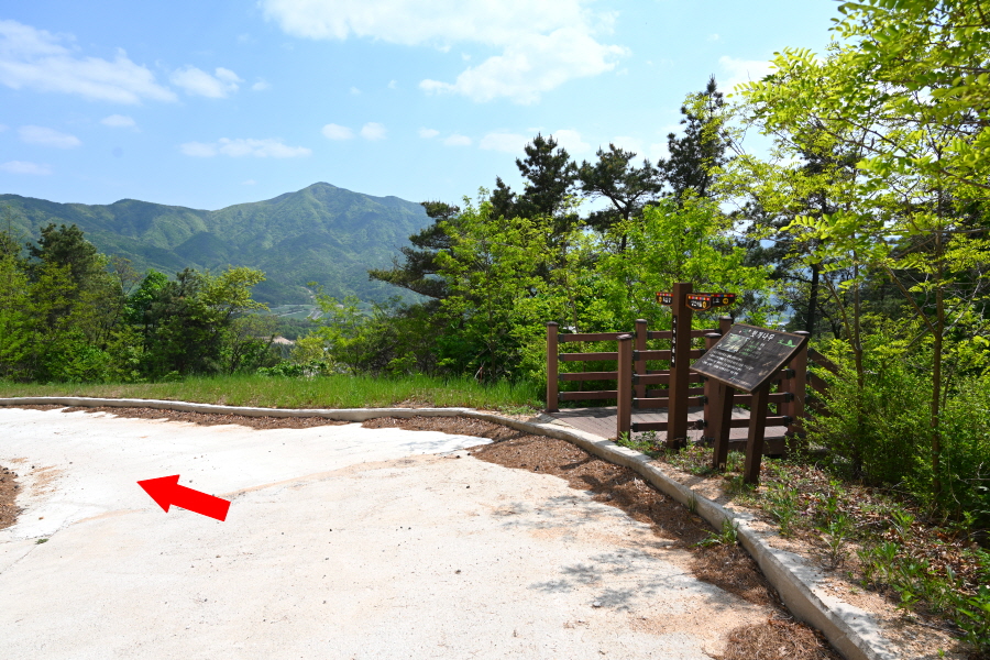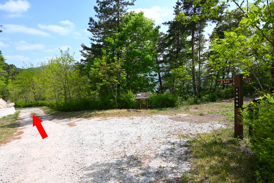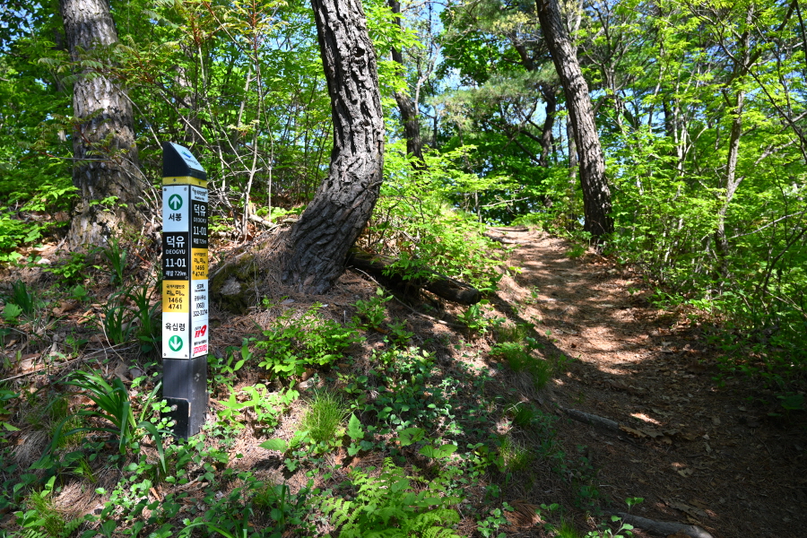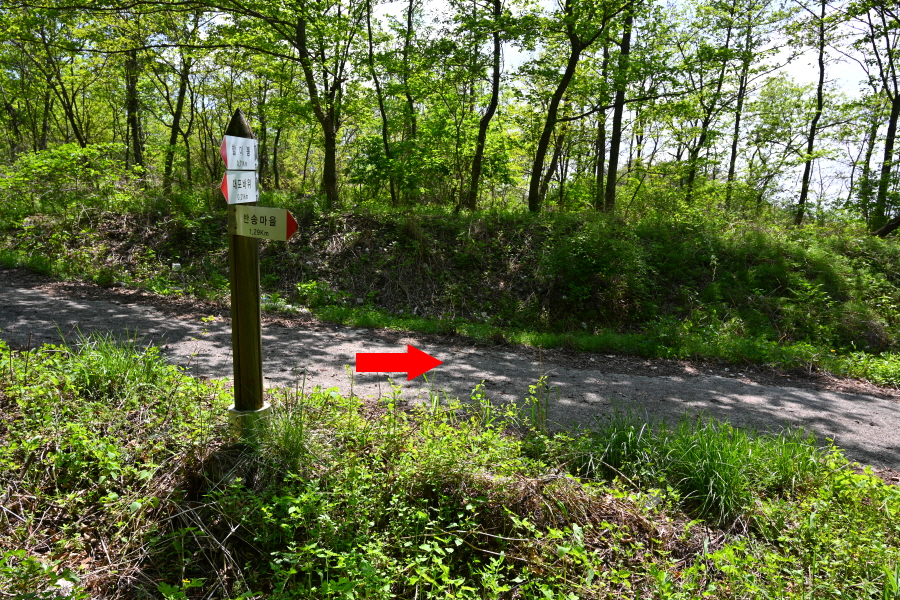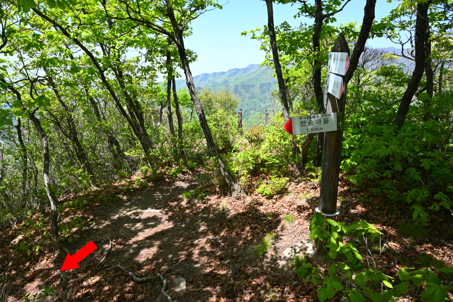하산은 정상석 앞을 지나 2분이면 나오는 갈림길에서 왼쪽 반송마을(1.93㎞)로 꺾습니다.