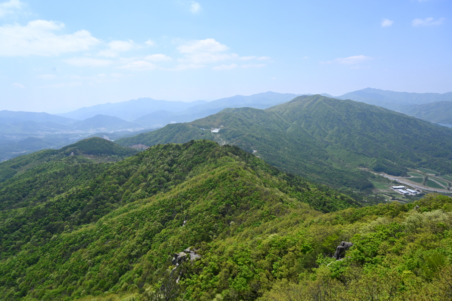 서쪽 일부만 빼고 넓게 조망이 열립니다. 북쪽으로 서봉에서 시계방향으로 남덕유산 남령 칼날봉 월봉산 황석산 도숭산 대봉산 백운산 육십령 깃대봉 영취산 장안산 팔공산 선각산 덕태산 성수산이 파노라마로 펼쳐집니다. 발아래 북쪽은 덕유학생교육원과 영각사가, 남쪽에는 제주경주마목장에 이어 국내 두번째 규모라는 ‘렛츠런 팜 장수목장’이 보입니다.
