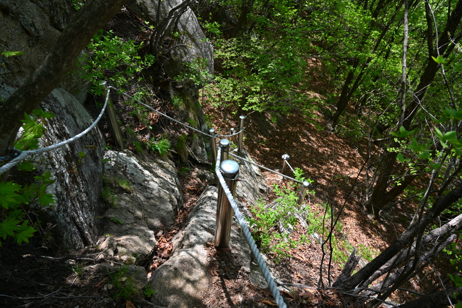 산길 양쪽은 안전로프가 묶인 급경사 구간인데 미끄러지지 않도록 합니다.