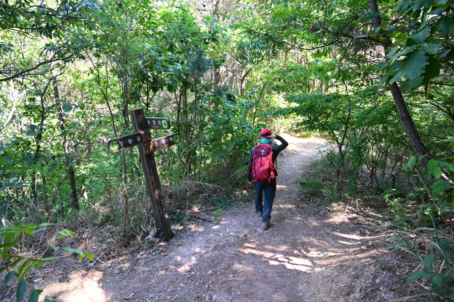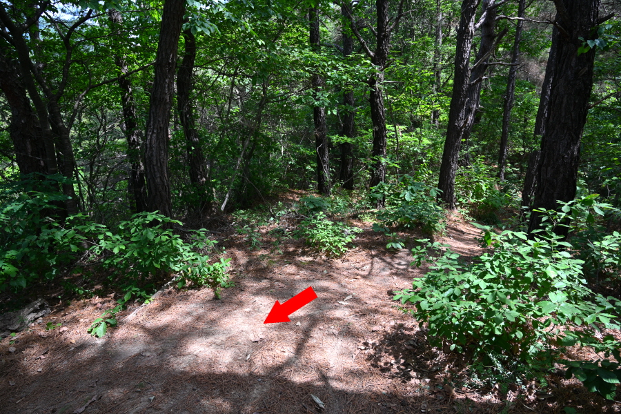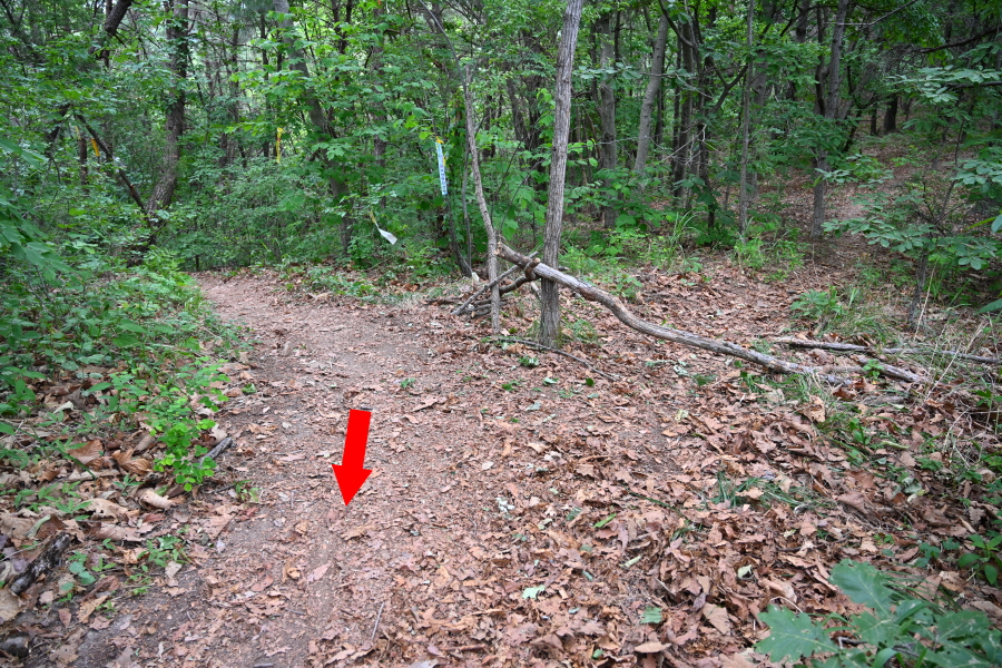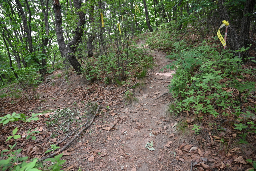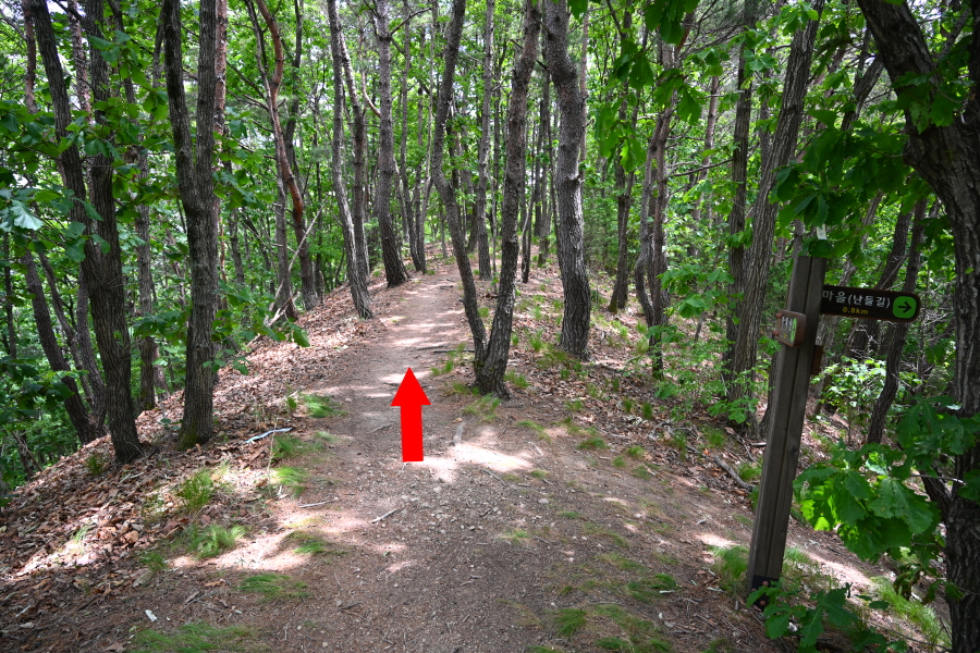 움푹 팬 동봉에 올라가면 이정표 없는 갈림길이 나옵니다. 산행 리본이 많이 달린 왼쪽으로 반드시 내려가야 합니다. 오른쪽 삼각점을 지나가면 난들마을로 곧장 내려가니 주의합니다.