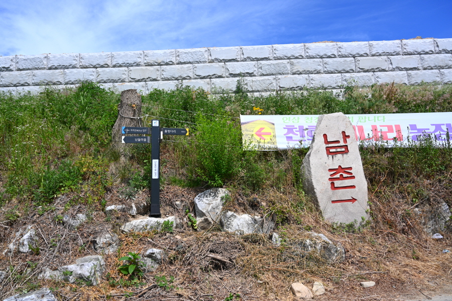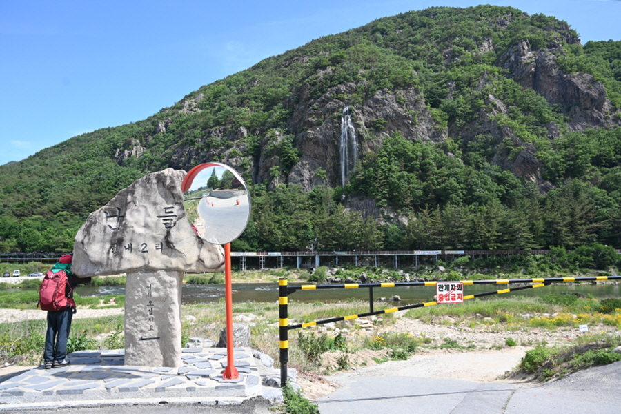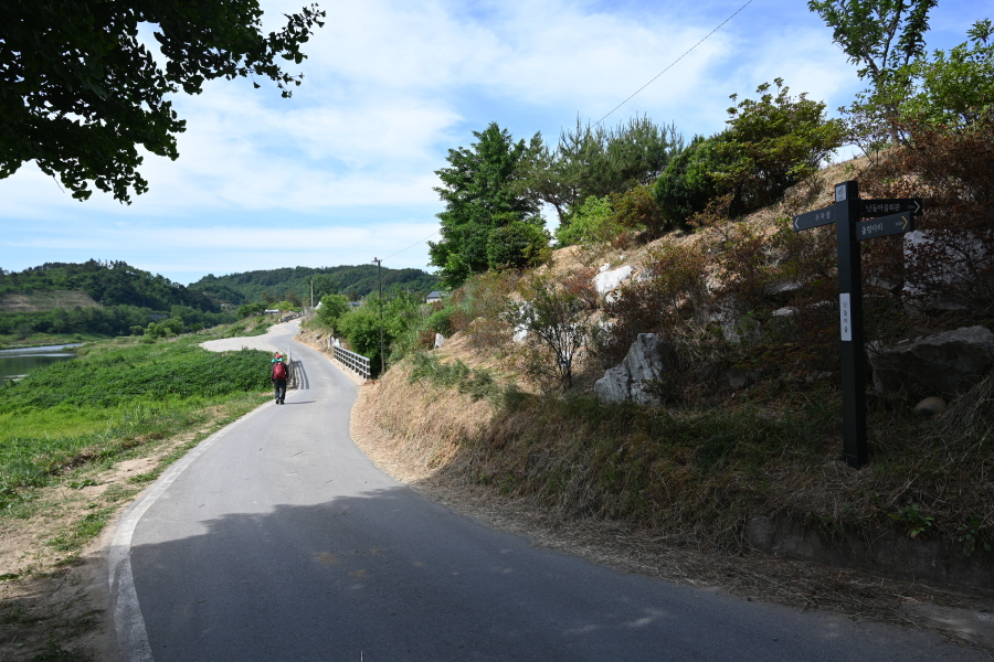 ‘난들’ 표석 앞을 지나 금강을 가로지르는 잠수교를 건너 난들마을 입구에서. 왼쪽 자지산 입구(1.1㎞)·난들마을로 갑니다. 오른쪽은 출렁다리와 부엉산으로 곧장 가는 길.
