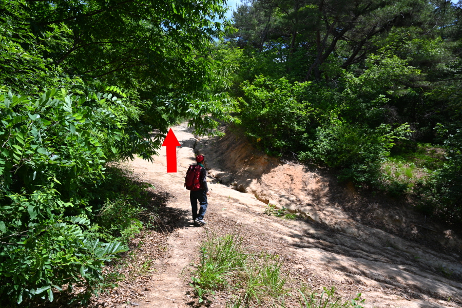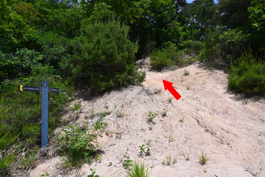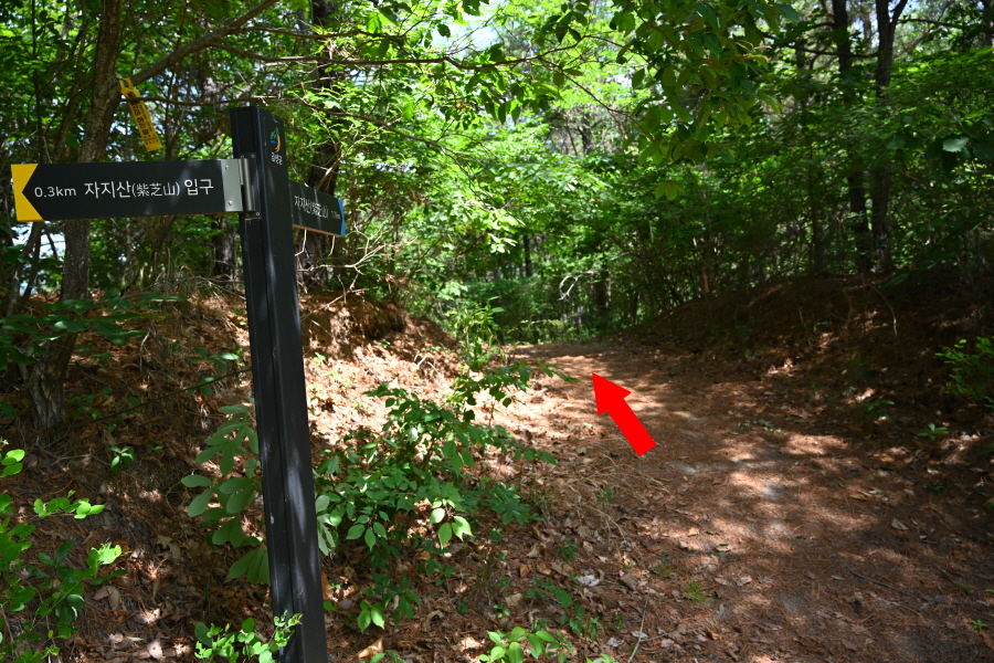 삼거리 임도에서 왼쪽이며, 다시 7분이면 왼쪽 자지산(1.1㎞) 방향으로 임도를 벗어나 마사토 길을 오릅니다.