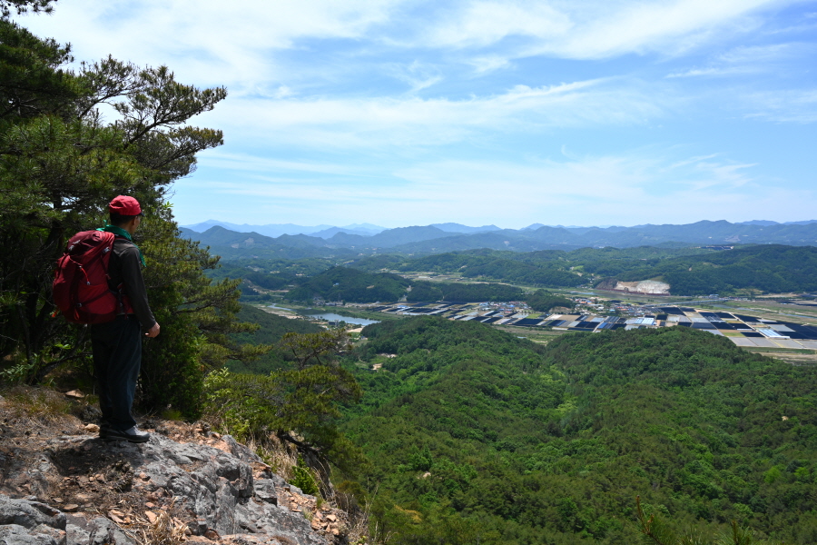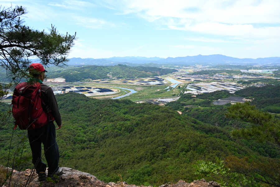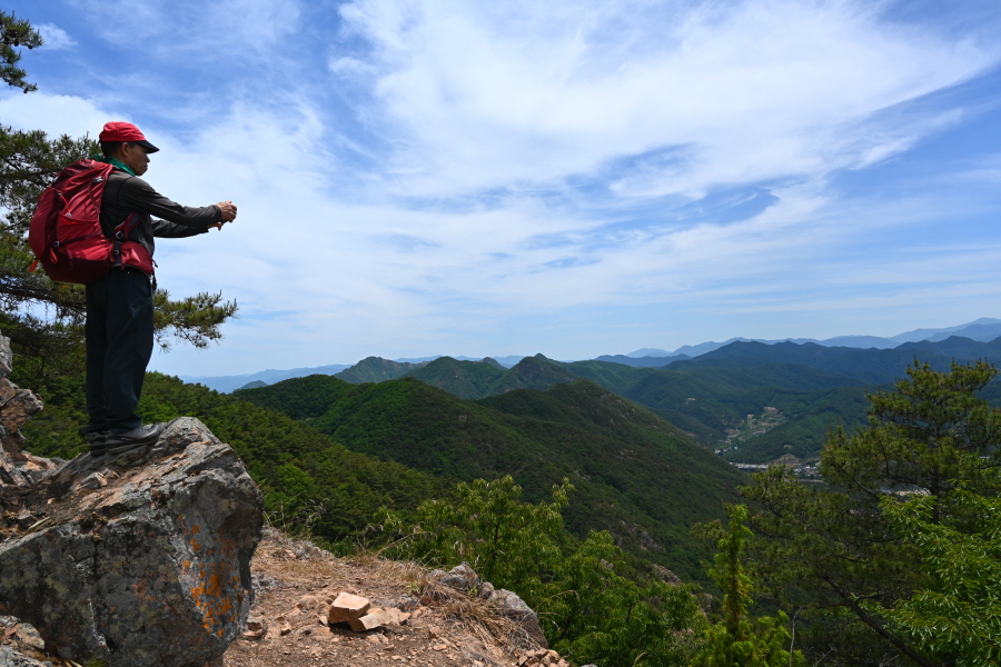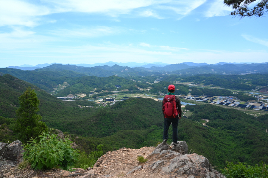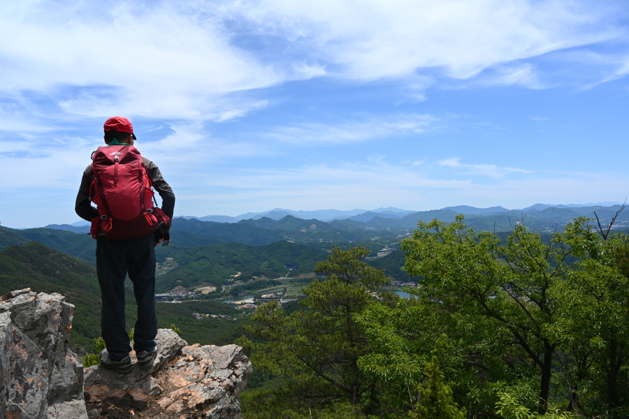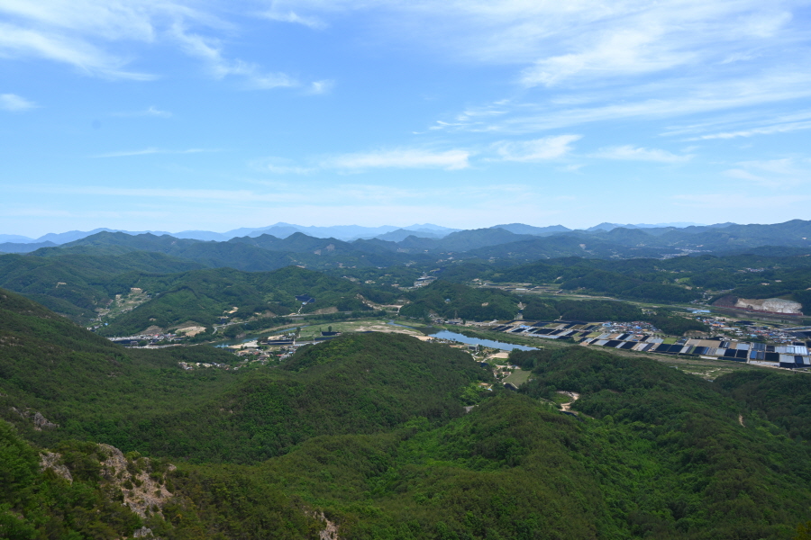 북쪽으로 멀리 기상관측소가 들어선 서대산에서 시계방향으로 대성산 천태산 갈기산 민주지산 월영산 부엉산 대덕산 적상산 북덕유산 남덕유산 장수덕유산(서봉) 진악산 대둔산 천앙산 등 쭈뼛쭈뼛한 봉우리가 파도치듯 밀려옵니다.