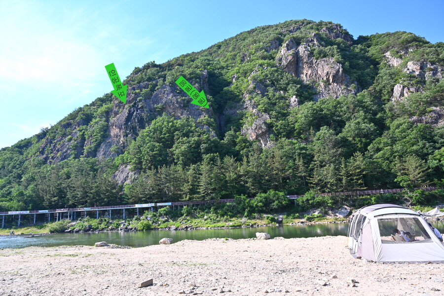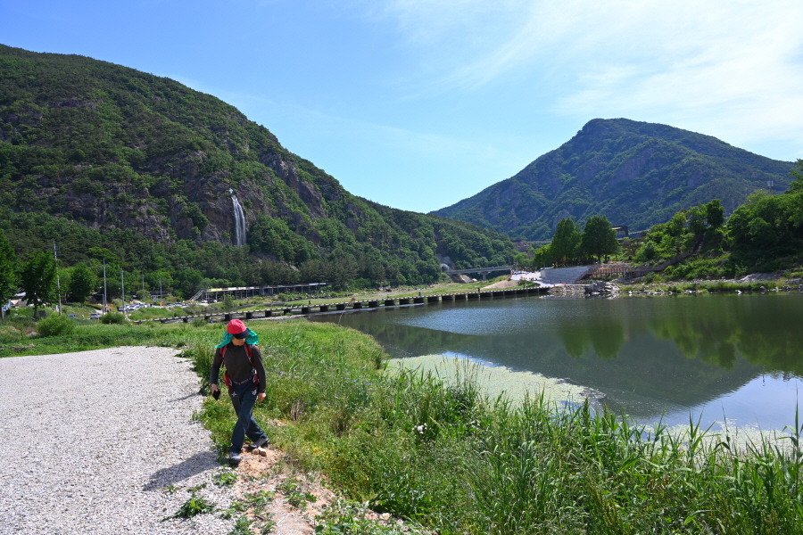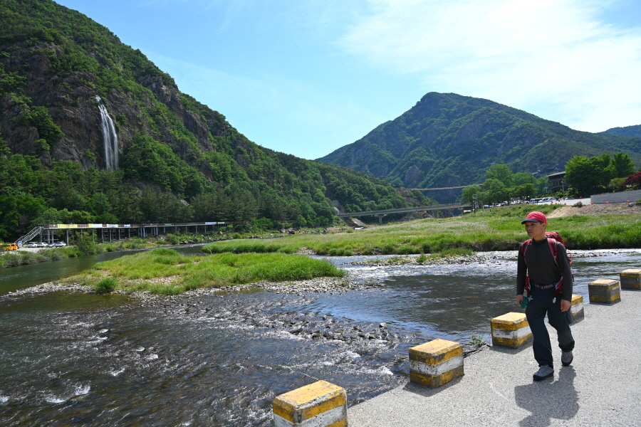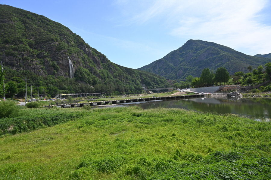 천변산책로를 따라 68번 도로의 천내교 아래를 지나 강 건너 인공폭포와 음굴(용굴)을 마주 보며 기러기공원 주차장에 도착합니다.