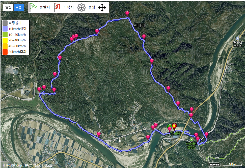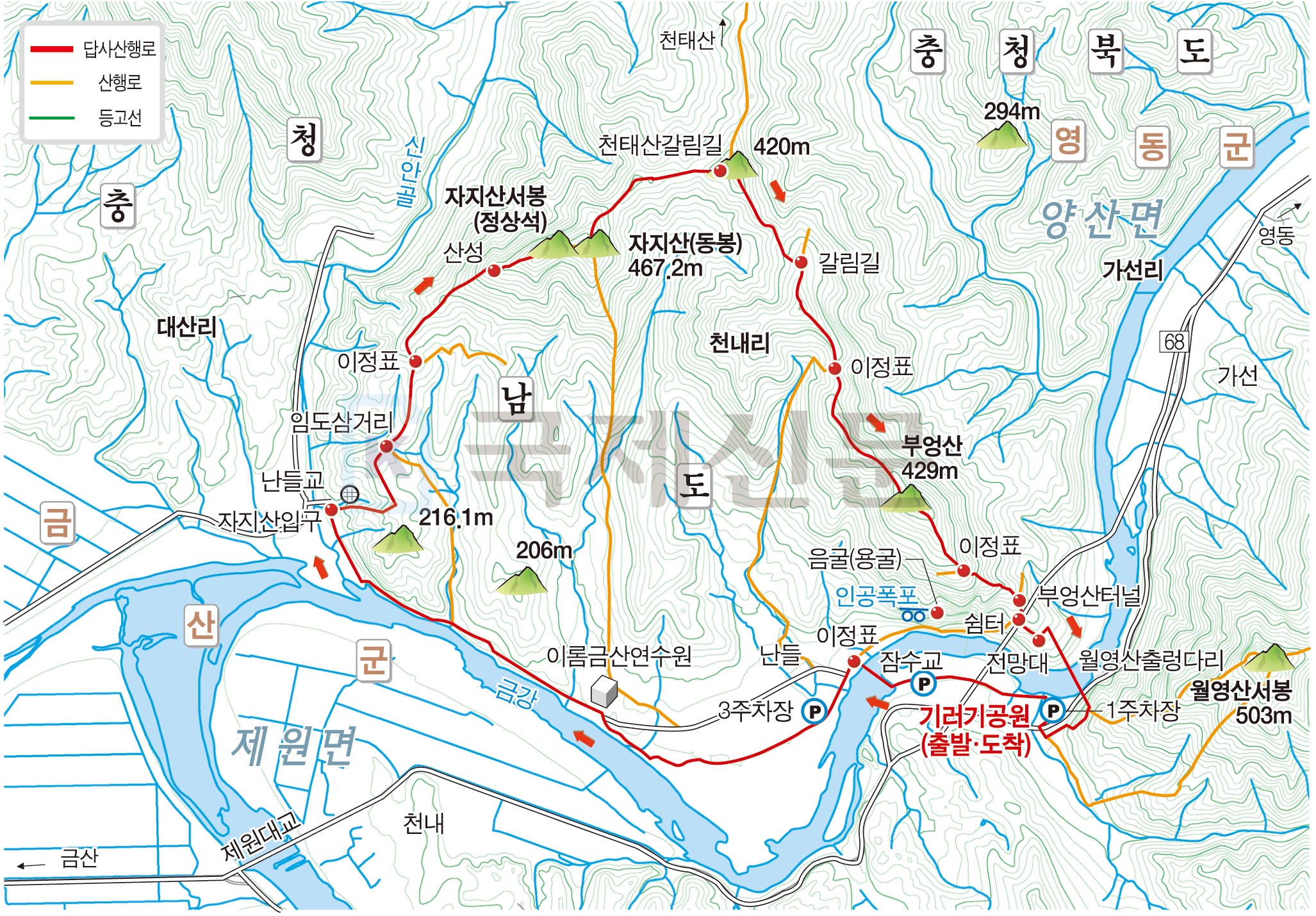 자지산~월영산 출렁다리 산행경로를 보겠습니다. 금산시 제원면 천내리 원골유원지의 기러기공원주차장을 출발해 난들마을을 건너는 잠수교~난들마을 입구~제 3주차장~이롬금산연수원 아래 삼거리~자지산 입구(난들교)~임도 삼거리~자지산성~자지산 동봉~서봉(삼각점) 갈림길~천태산 갈림길~부엉산·마을(난들길) 갈림길~부엉산 정상~부엉산·마을(난들길) 갈림길~쉼터 광장~출렁다리~월영산 출렁다리 출입문~도로 갈림길~제 1 주차장~68번 도로 천내교 아래~기러기 공원(제 2 주차장)으로 되돌아오는 원점회귀입니다. 산행거리는 약 8.5㎞이며, 4시간 안팎이 걸립니다. 월영산 출렁다리와 금강 조망이 워낙 빼어나 산행시간은 별의미가 없습니다.