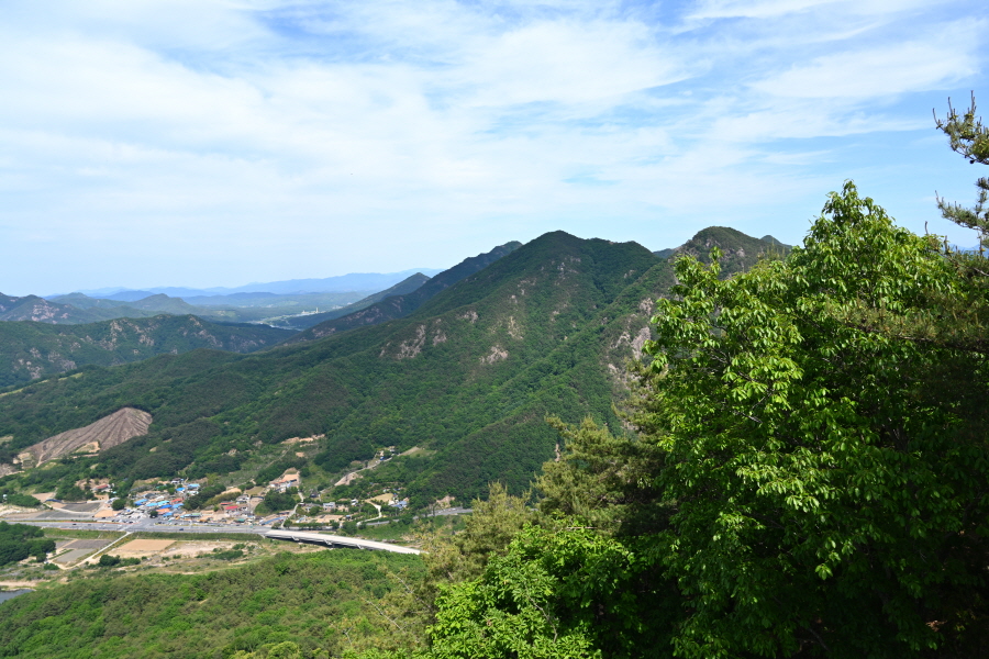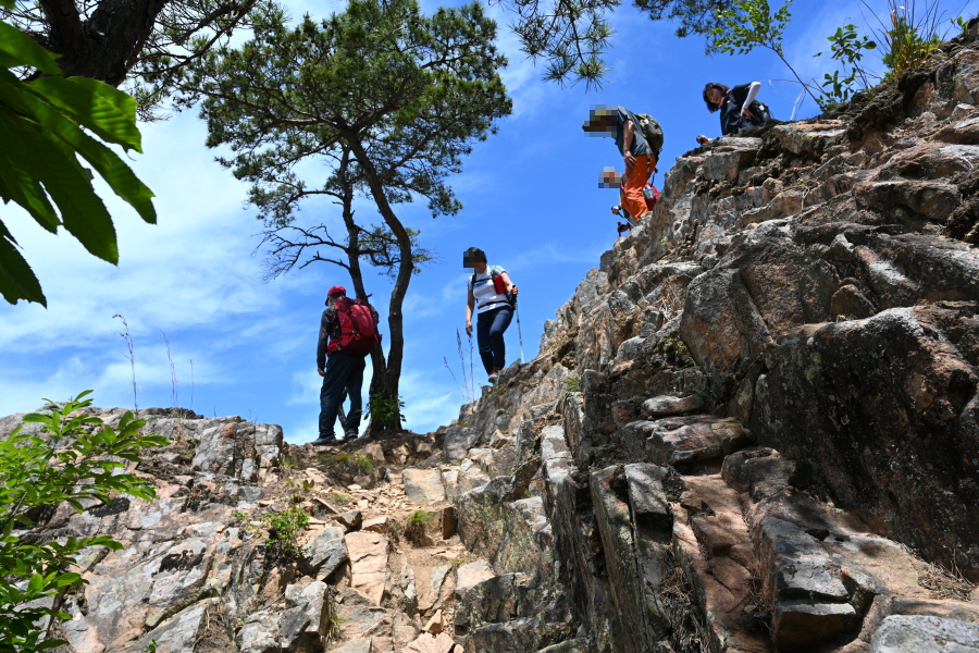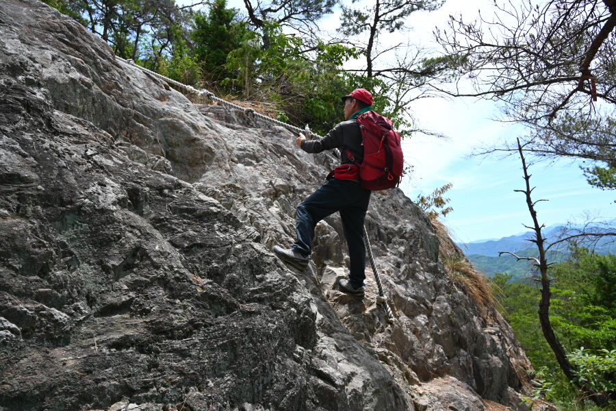 소나무 숲을 빠져 나가면 로프가 걸린 두 곳의 바위를 지납니다. 산길 좌우는 깎아 세운 바위 벼랑이라 곳곳이 전망대가 나옵니다.