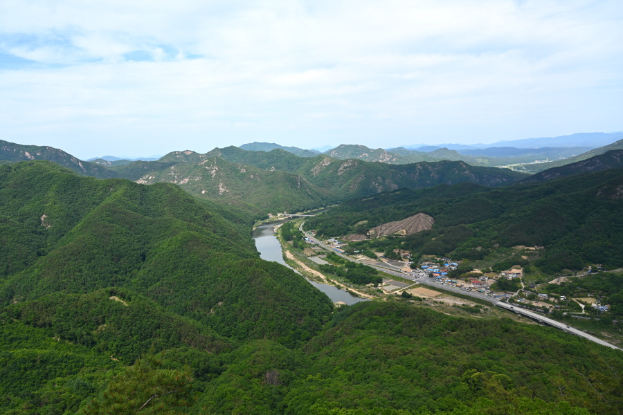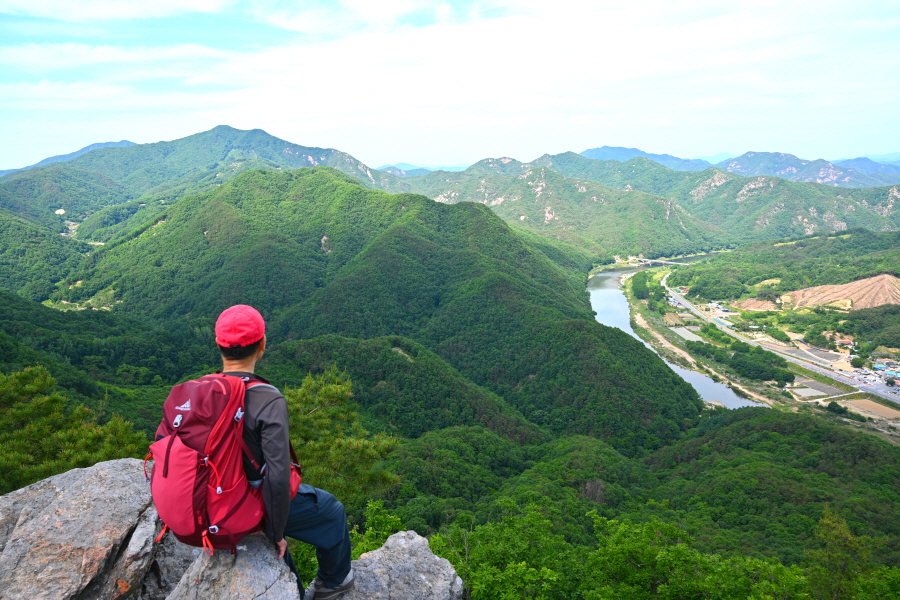 남쪽 발아래는 S자로 굽어 도는 금강이 서쪽에서 남쪽으로 흐르는 독특한 지형입니다. 출렁다리로 하산은 정상석 앞을 지나 능선을 탑니다.