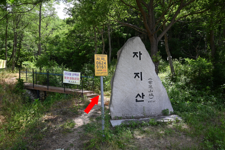 주차장에서 약 40분이면 난들교 직전 오른쪽에 자지산 표석과 등산안내도가 세워진 산행 들머리에 도착합니다.