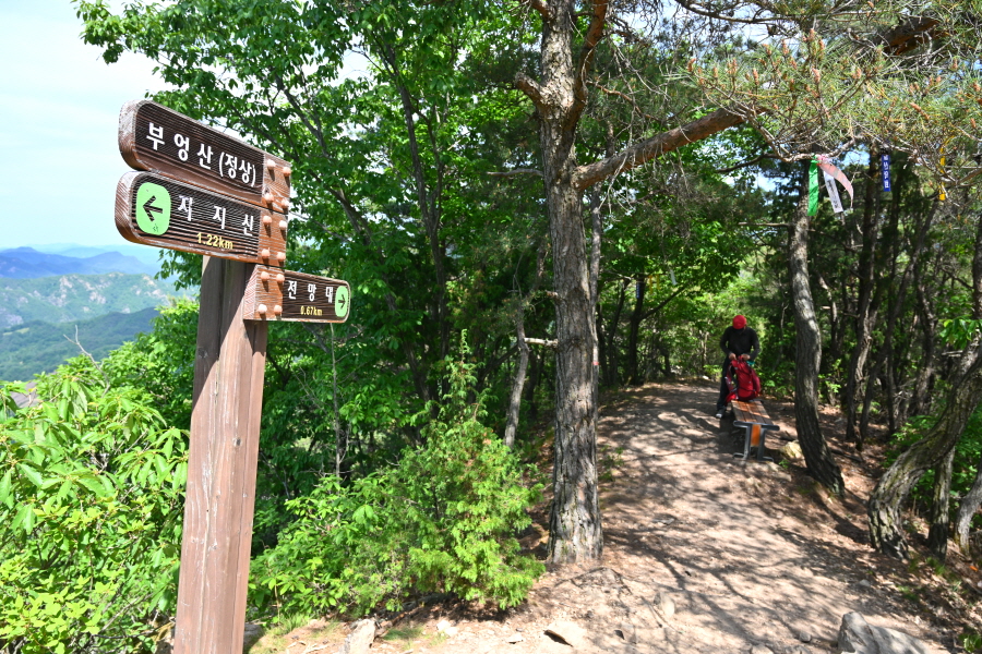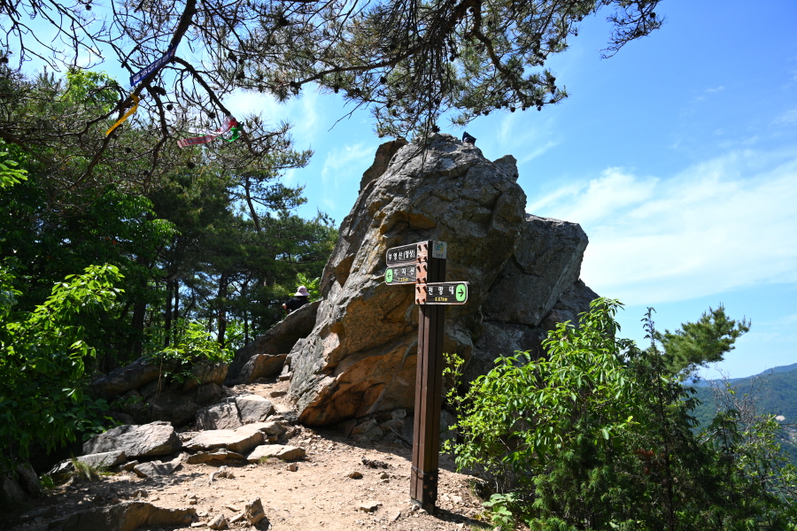 천태산 갈림길에서 약 30분이면 큰 바위가 앉은 부엉산 정상에 도착합니다.