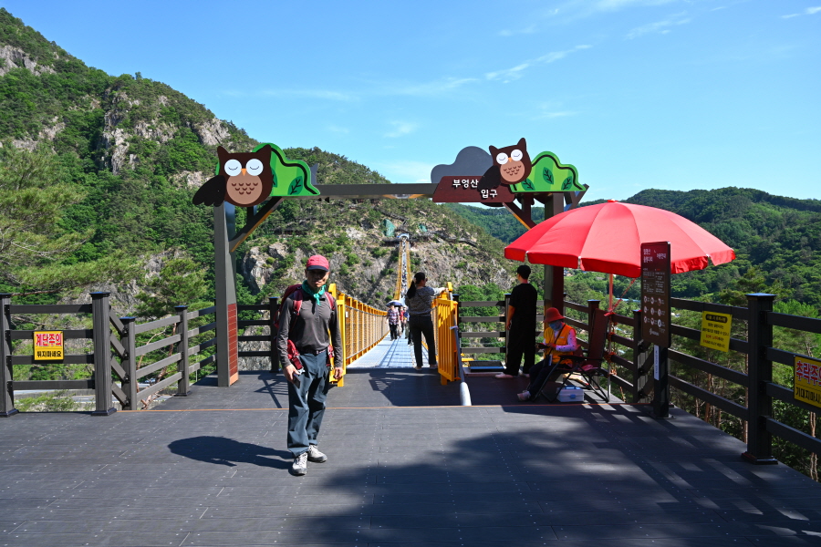 부엉산 출렁다리 출입문을 통과해 금강을 가로질러 월영산 출렁다리 출입문에 도착합니다.